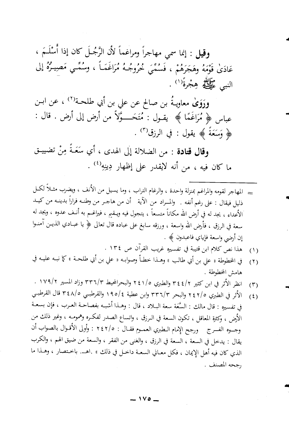 وقيل انما سمي مهاجرا ومراغما لان الرجل كان إذا أسلم عادى قومه وهجرهم فسمي خروجه مراغما وسمي مصيره الى النبي صلى الله عليه وسلم هجرة وروى معاوية بن صالح عن علي بن أبي طلحة عن ابن عباس (مراغما) يقول متحولا من أرض الى ارض قال (وسعة) يقول في الرزق وقال قتادة من الضلالة الى الهدى أي سعة من تضييق ما كان فيه من انه لا يقدر على اظهار دينه