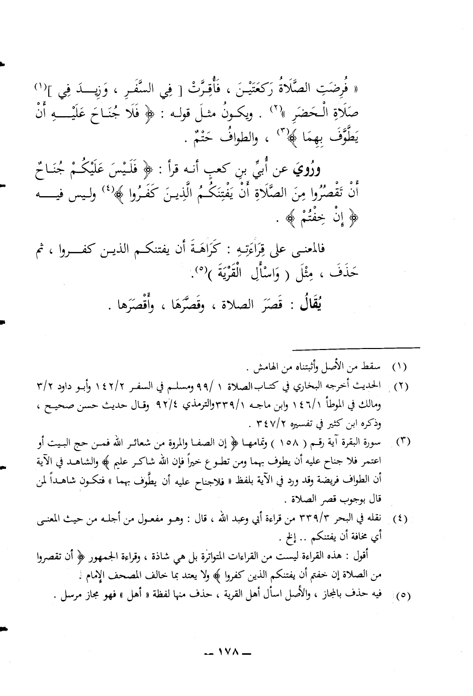 فرضت الصلاة ركعتين فأقرت في السفر وزيد في صلاة الحضر ويكون مثل قوله (فلا جناح عليه أن يطوف بهما) والطواف حتم وروي عن أبي بن كعب أنه قرأ (فليس عليكم جناح أن تقصروا من الصلاة أن يفتنكم الذين كفروا) وليس فيه ان خفتم فالمعنى على قراءته كراهة أن يفتنكم الذين كفروا ثم حذف مثل (واسأل القرية) يقال قصر الصلاة وقصرها وأقصرها
