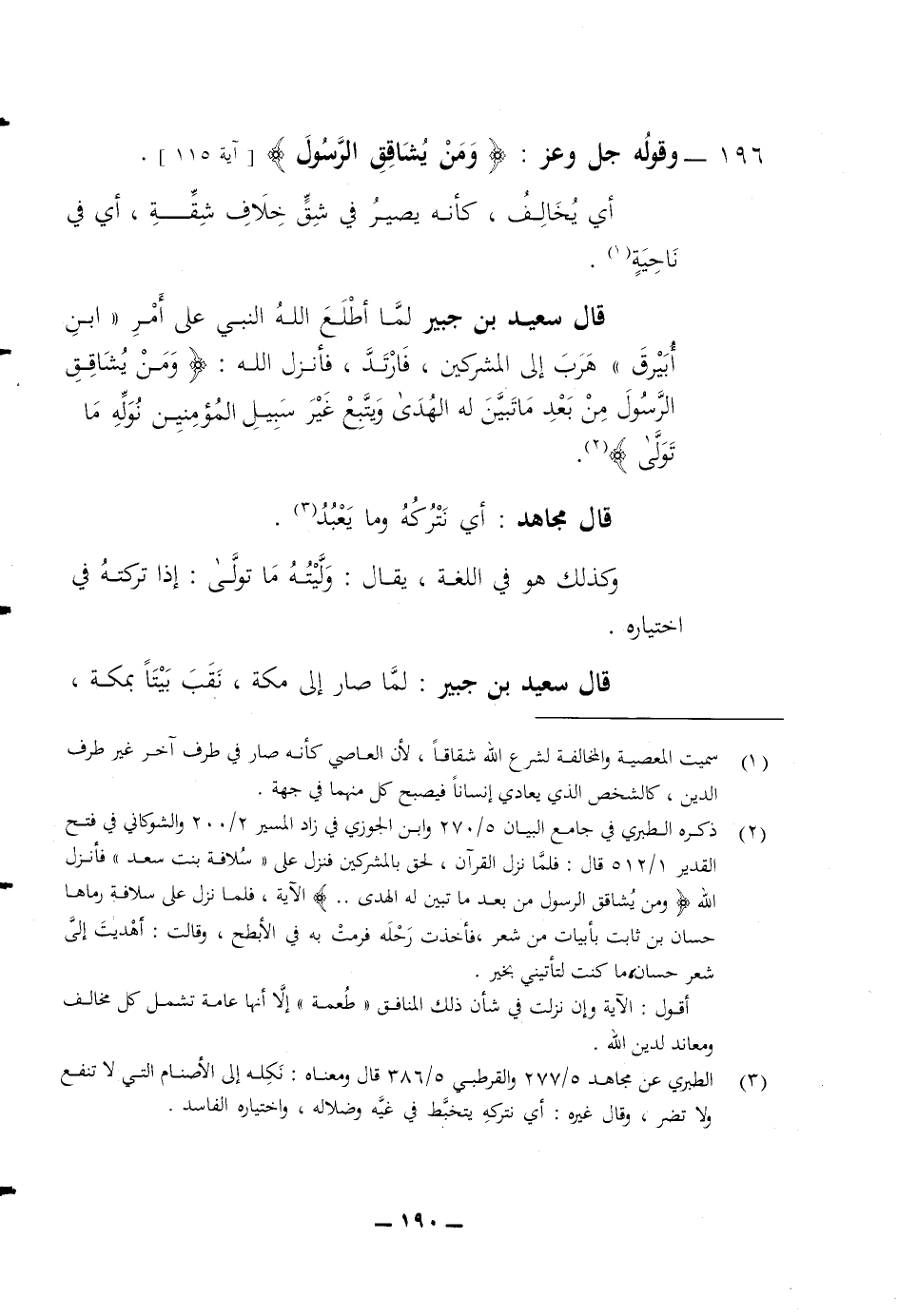 196 وقوله جل وعز (ومن يشاقق الرسول) أي يخالف كأنه يصير في شق خلاف شقة أي في ناحية قال سعيد بن جبير لما أطلع الله النبي على أمر ابن أبيرق هرب الى المشركين فارتد فأنزل الله (ومن يشاقق الرسول من بعد ما تبين له الهدى ويتبع غير سبيل المؤمنين نوله ما تولى) قال مجاهد أي نتركه وما يعبد وكذلك هو في اللغة يقال وليته ما تولى إذا تركته في اختياره قال سعيد بن جبير لما صار الى مكة نقب بيتا بمكة