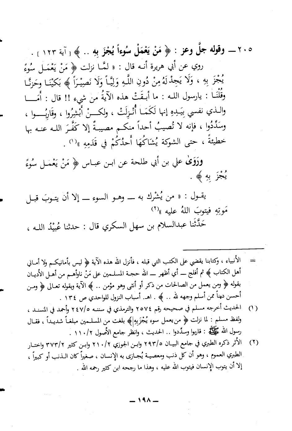 205 وقوله جل وعز (من يعمل سوءا يجز به) روي عن أبي هريرة أنه قال لما نزلت (من يعمل سوءا يجز به ولا يجد له من دون الله وليا ولا نصيرا) بكينا وحزنا وقلنا يا رسول الله ما أبقت هذه الآية من شئ قال (أما