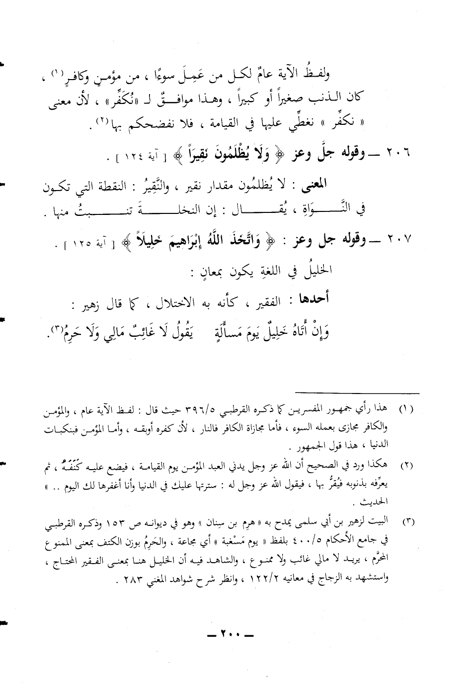 المعنى لا يظلمون مقدار نقير والنقير النقطة التى تكون في النواة يقال ان النخلة تنبت منها 207 وقوله جل وعز (واتخذ الله ابراهيم خليلا) الخليل في اللغة يكون بمعان أحدها الفقير كأنه به الاختلال كما قال زهير وان أتاه خليل يوم مسألة يقول لا غائب مالي ولا حرم