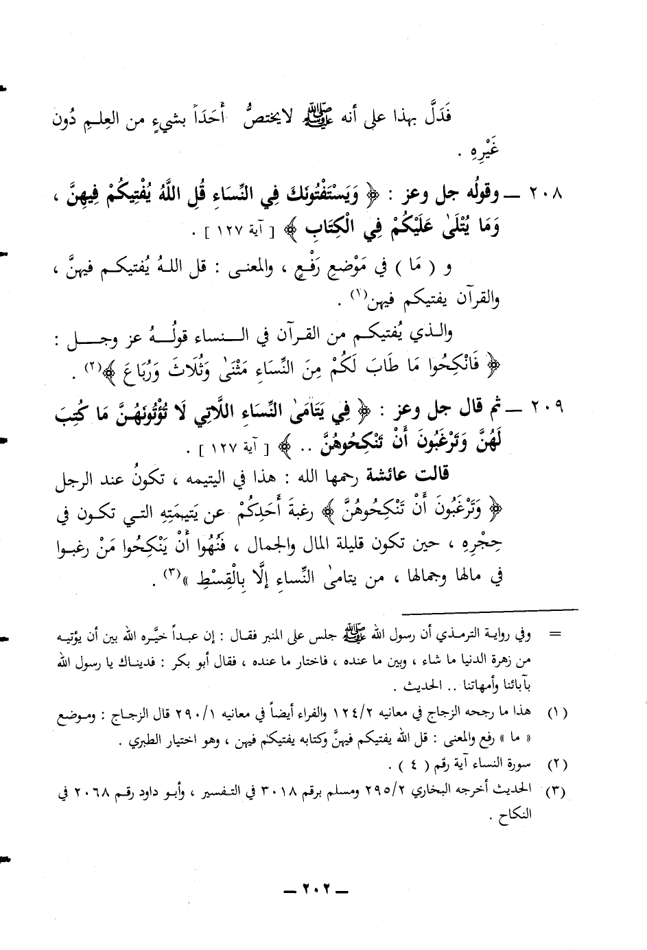 والقرآن يفتيكم فيهن والذي يفتيكم من القرآن في النساء قوله عز وجل (فانكحوا ما طاب لكم من النساء مثنى وثلاث ورباع) 209 ثم قال جل وعز (في يتامى النساء اللاتي لا تؤتونهن ما كتب لهن وترغبون أن تنكحوهن) قالت عائشة رحمها الله هذا في اليتيمة تكون عند الرجل (وترغبون أن تنكحوهن) رغبة أحدكم عن يتيمته التي تكون في حجره حين تكون قليلة المال والجمال فنهوا أن ينكحوا من رغبوا في مالها وجمالها من يتامى النساء الا بالقسط