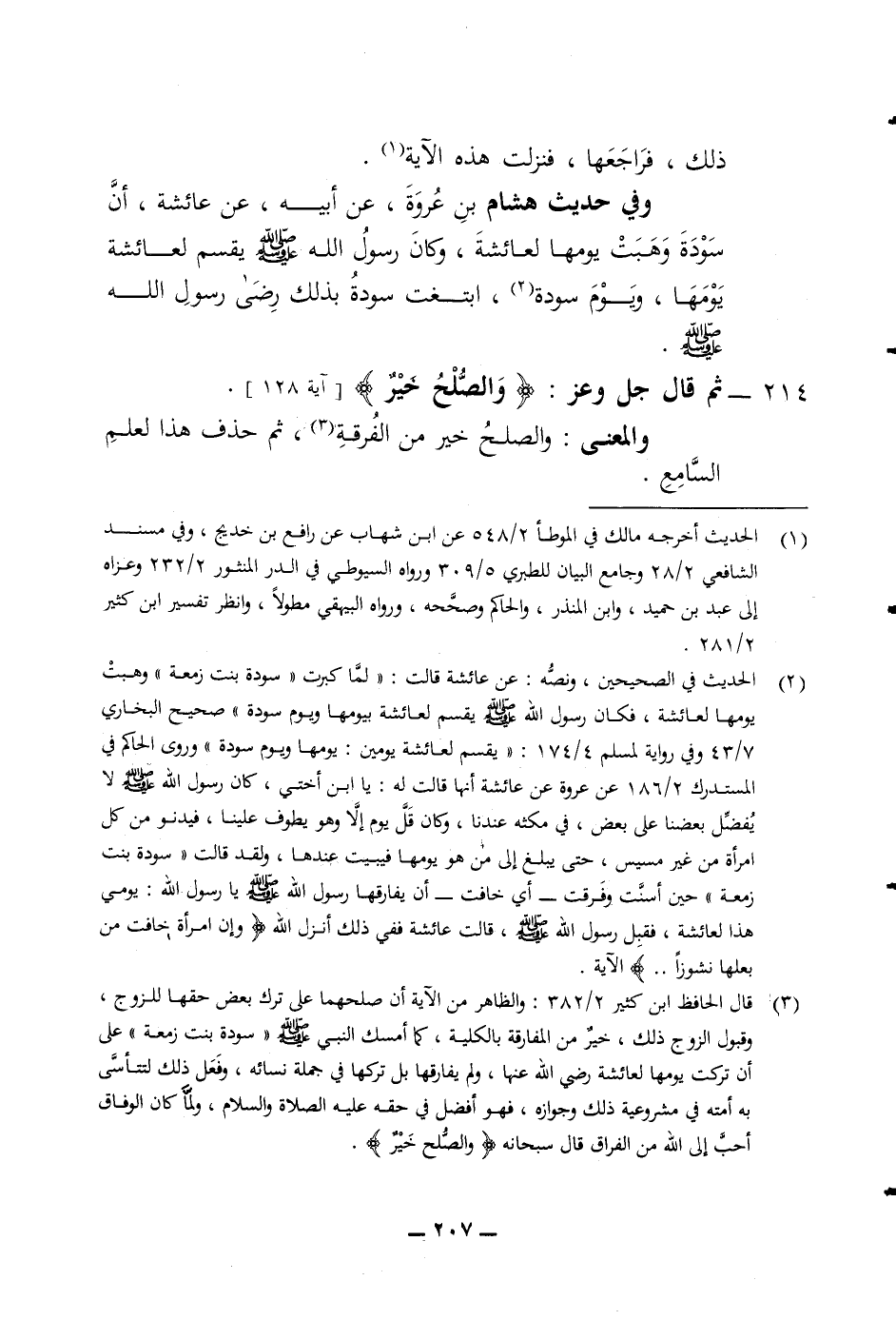 ذلك فراجعها فنزلت الآية وفي حديث هشام بن عروة عن أبيه عن عائشة أن سودة وهبت يومها لعائشة وكان رسول الله صلى الله عليه وسلم يقسم لعائشة يومها ويوم سودة ابتغت سودة بذلك رضى رسول الله صلى الله عليه وسلم 214 ثم قال جل وعز (والصلح خير) والمعنى والصلح خير من الفرقة ثم حذف هذا لعلم السامع
