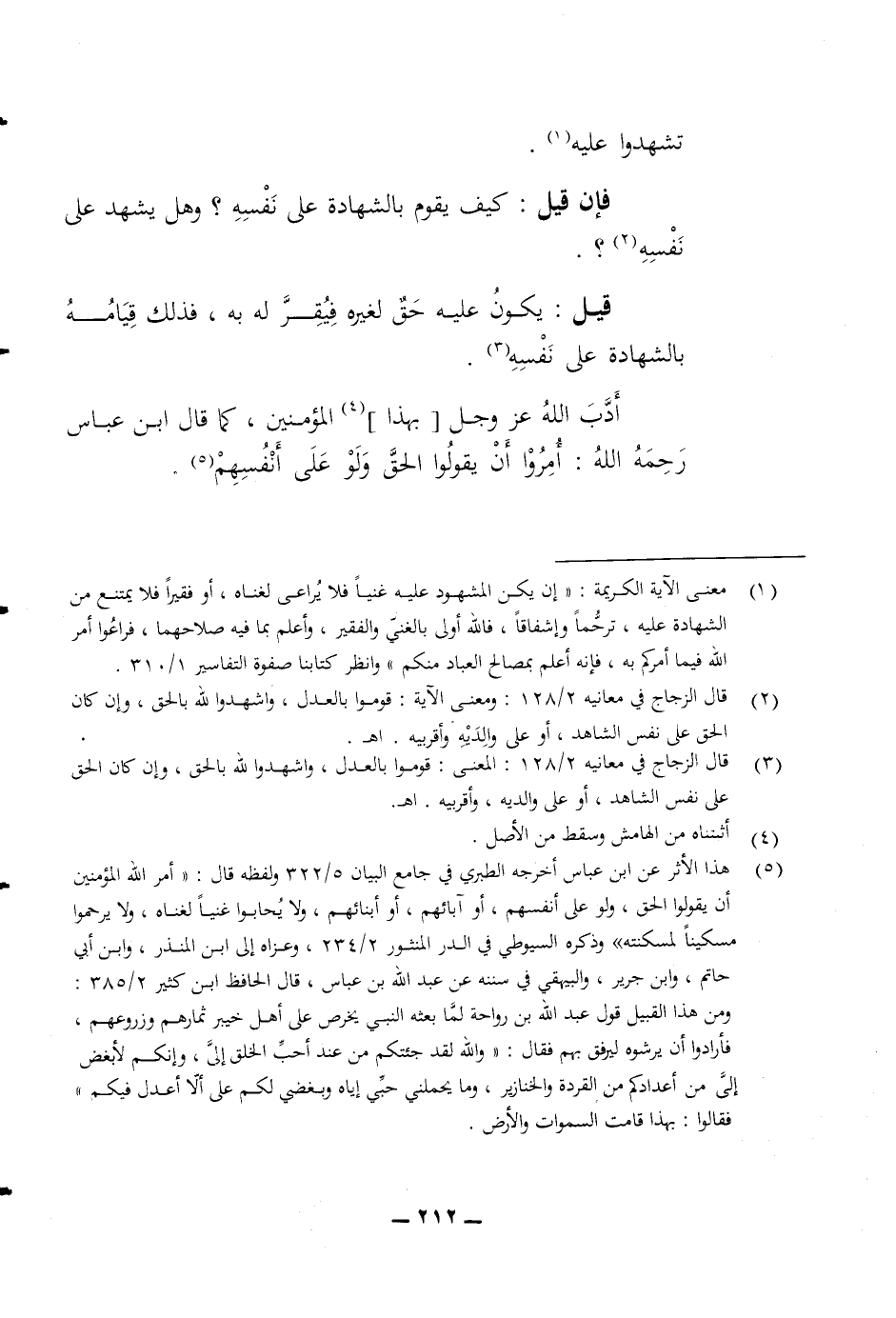 تشهدوا عليه فان قيل كيف يقوم بالشهادة على نفسه وهل يشهد على نفسه قيل يكون عليه حق لغيره فيقر له به فذلك قيامه بالشهادة على نفسه أدب الله عز وجل بهذا المؤمنين كما قال ابن عباس رحمه الله أمروا أن يقولوا الحق ولو على أنفسهم