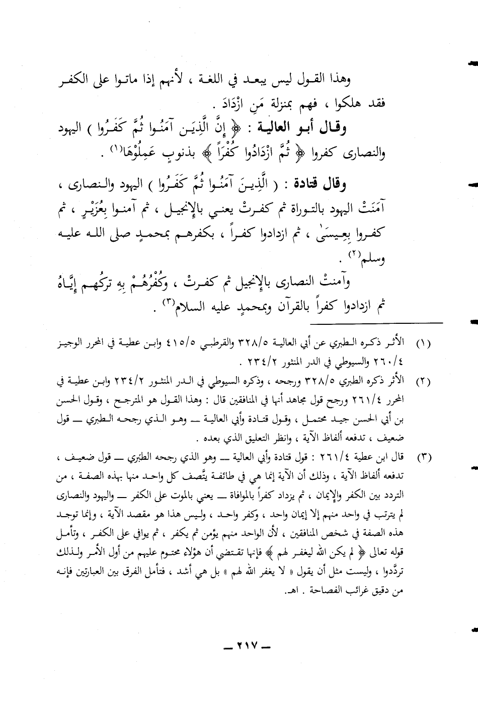 وقال أبو العالية (ان الذين آمنوا ثم كفروا) اليهود والنصارى (ثم ازدادوا كفرا) بذنوب عملوها وقال قتادة (الذين آمنوا ثم كفروا) اليهود والنصارى آمنت اليهود بالتوراة ثم كفرت يعني بالانجيل ثم آمنوا بعزير ثم كفروا بعيسى ثم ازدادوا كفرا بكفرهم بمحمد صلى الله عليه وسلم وآمنت النصارى بالانجيل ثم كفرت وكفرهم به تركهم اياه ثم ازدادوا كفرا بالقرآن وبمحمد عليه السلام