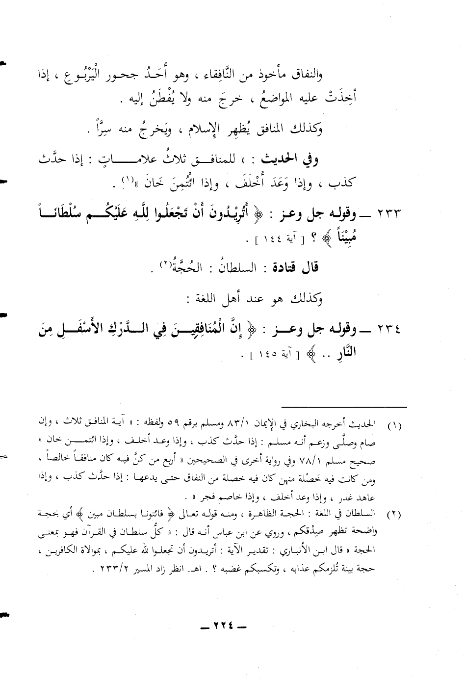 والنفاق مأخوذ من النافقاء وهو أحد جحور اليربوع إذا أخذت عليه المواضع خرج منه ولا يفطن إليه وكذلك المنافق يظهر الاسلام ويخرج منه سرا وفي الحديث (للمنافق ثلاث علامات إذا حدث كذب وإذا وعد أخلف وإذا ائتمن خان) 233 وقوله جل وعز (أتريدون أن تجعلوا لله عليكم سلطانا مبينا) قال قتادة السلطان الحجة وكذلك هو عند أهل اللغة 234 وقوله جل وعز (ان المنافقين في الدرك الاسفل من النار)