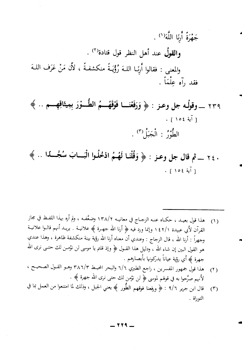 جهرة أرنا الله والقول عند أهل النظر قول قتادة والمعنى فقالوا أرنا الله رؤية منكشفة لان من عرف الله فقد رآه علما 239 وقوله جل وعز (ورفعنا فوقهم الطور بميثاقهم) الطور الجبل 240 ثم قال جل وعز (وقلنا لهم ادخلوا الباب سجدا)