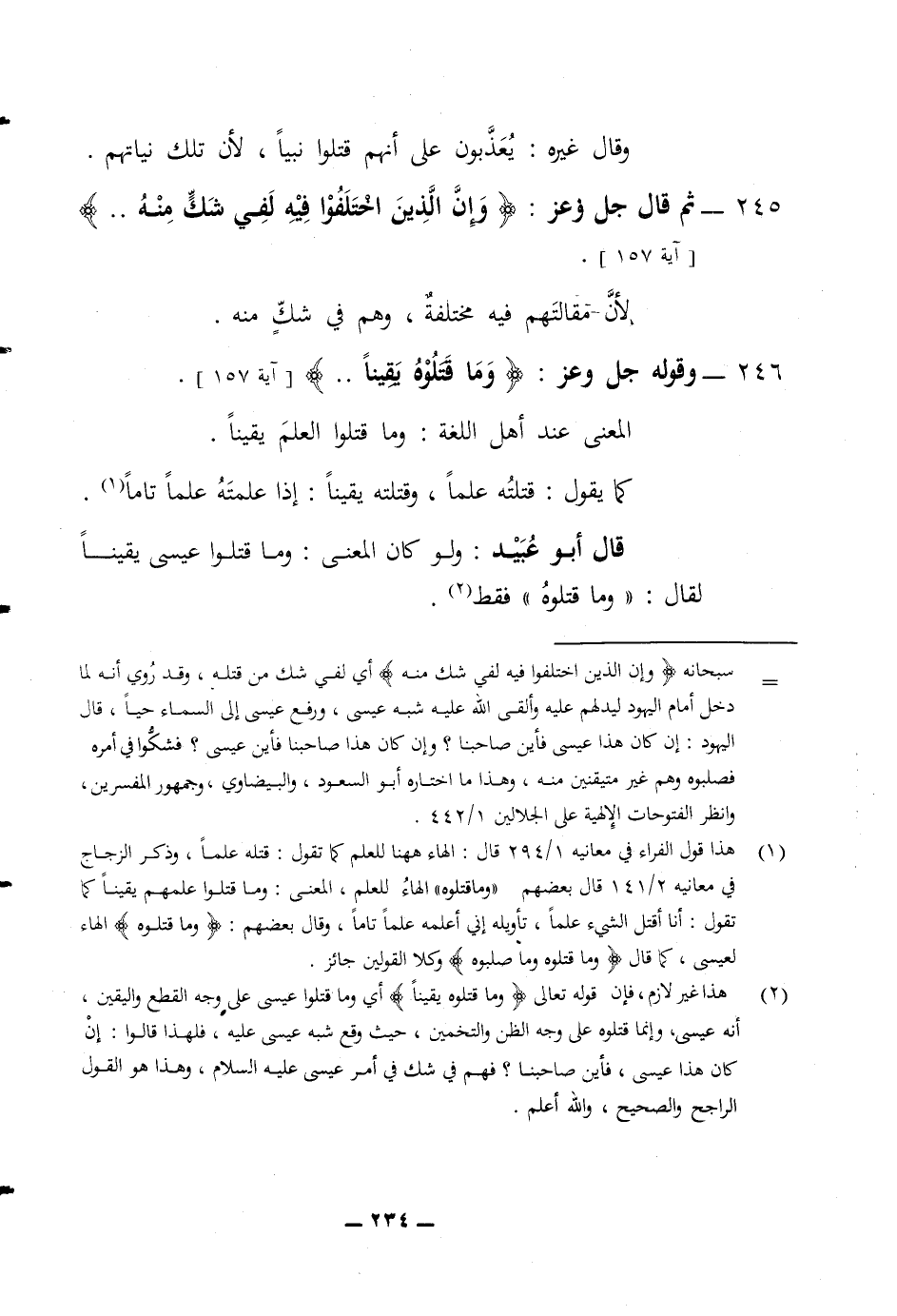 وقال غيره يعذبون على أنهم قتلوا نبيا لان تلك نياتهم 245 ثم قال جل وعز (وان الذين اختلفوا فيه لفي شك منه) لان مقالتهم فيه مختلفة وهم في شك منه 246 وقوله جل وعز (وما قتلوه يقينا) المعنى عند أهل اللغة وما قتلوا العلم يقينا كما يقول قتلته علما وقتلته يقينا إذا علمته علما تاما قال أبو عبيد ولو كان المعنى وما قتلوا عيسى يقينا لقال وما قتلوه فقط