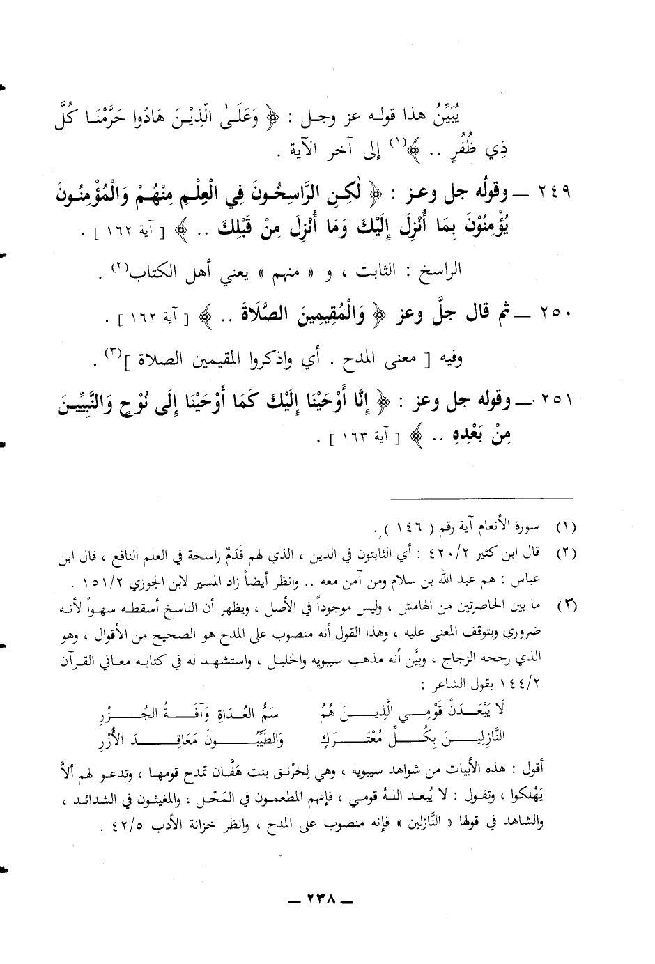 يبين هذا قوله عز وجل (وعلى الذين هادوا حرمنا كل ذي ظفر) الى آخر الآية 249 وقوله جل وعز (لكن الراسخون في العلم منهم والمؤمنون يؤمنون بما أنزل اليكم وما أنزل من قبلك) الراسخ الثابت ومنهم يعني أهل الكتاب 250 ثم قال جل وعز (والمقيمين الصلاة) وفيه معنى المدح أي واذكرو المقيمين الصلاة 251 وقوله جل وعز (انا أوحينا اليك كما أوحينا الى نوح والنبيين من بعده)