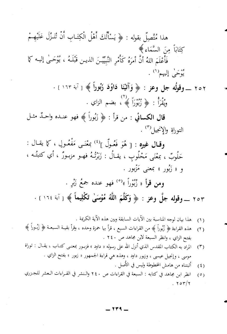 هذا متصل بقوله (يسألك أهل الكتاب أن تنزل عليهم كتابا من السماء) فأعلم الله أن أمره كأمر النبيين الذين قبله يوحى إليه كما يوحى إليهم 252 وقوله جل وعز (وآتينا داود زبورا) ويقرأ زبورا بضم الزاي قال الكسائي من قرأ زبورا فهو عنده واحد مثل التوراة والانجيل وقال غيره هو فعول بمعنى مفعول كما يقال