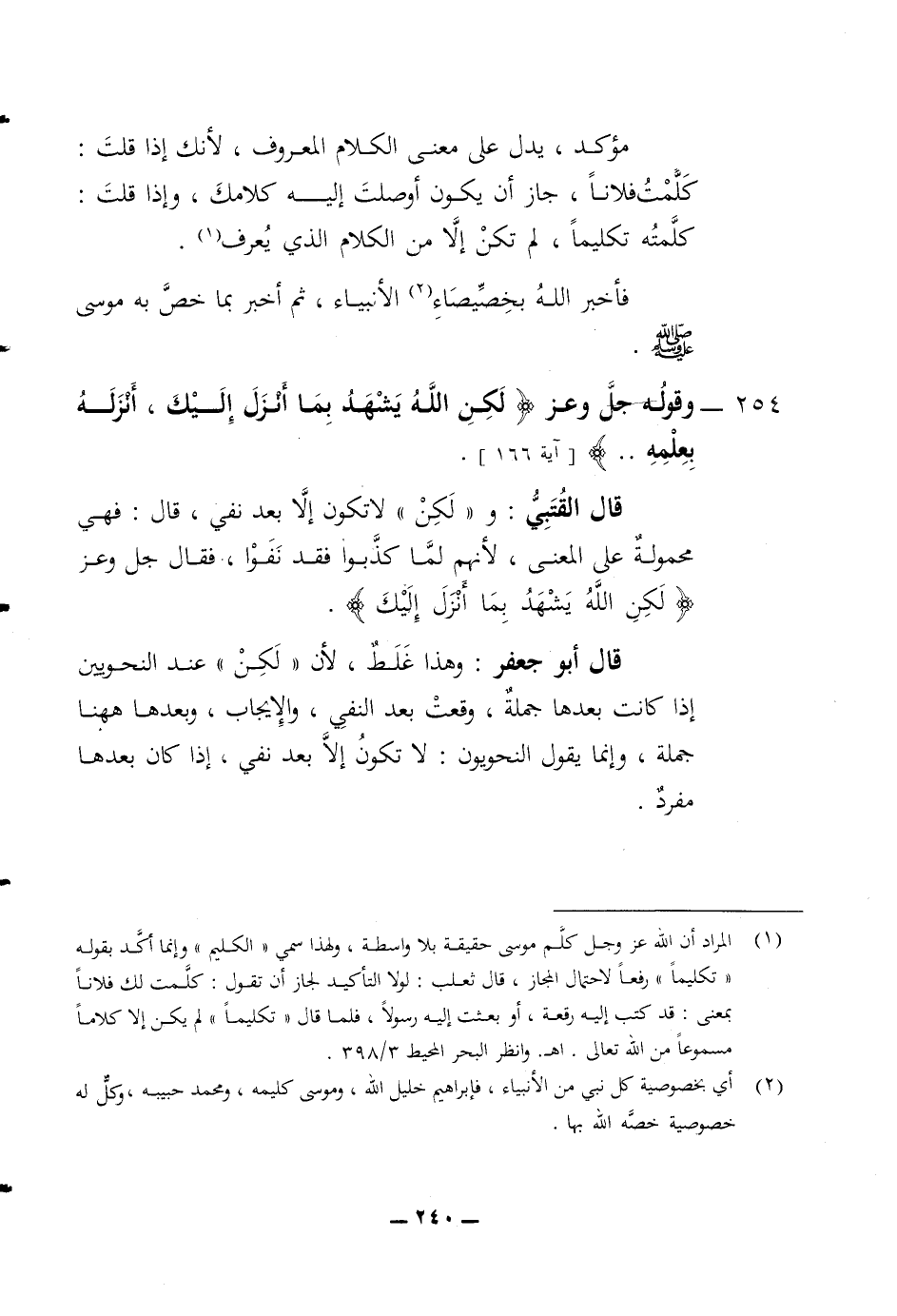 مؤكد يدل على معنى الكلام المعروف لانك إذا قلت كلمت فلانا جاز أن يكون أوصلت إليه كلامك وإذا قلت كلمته تكليما لم تكن الا من الكلام الذي يعرف فأخبره الله بخصيصاء ولم الانبياء ثم أخبر بما خص به موسى صلى الله عليه وسلم 254 وقوله جل وعز (لكن الله يشهد بما أنزل اليك أنزله بعلمه) قال القتبي ولكن لا تكون الا بعد نفي قال فهي محمولة على المعنى لانهم لما كذبوا فقد نفوا فقال جل وعز (لكن الله يشهد بما أنزل اليك) قال أبو جعفر وهذا غلط لان لكن عند النحويين إذا كانت بعدها جملة وقعت بعد النفي والايجاب وبعدها ههنا جملة وانما يقول النحويون لا تكون الا بعد نفي إذا كان بعدها مفرد