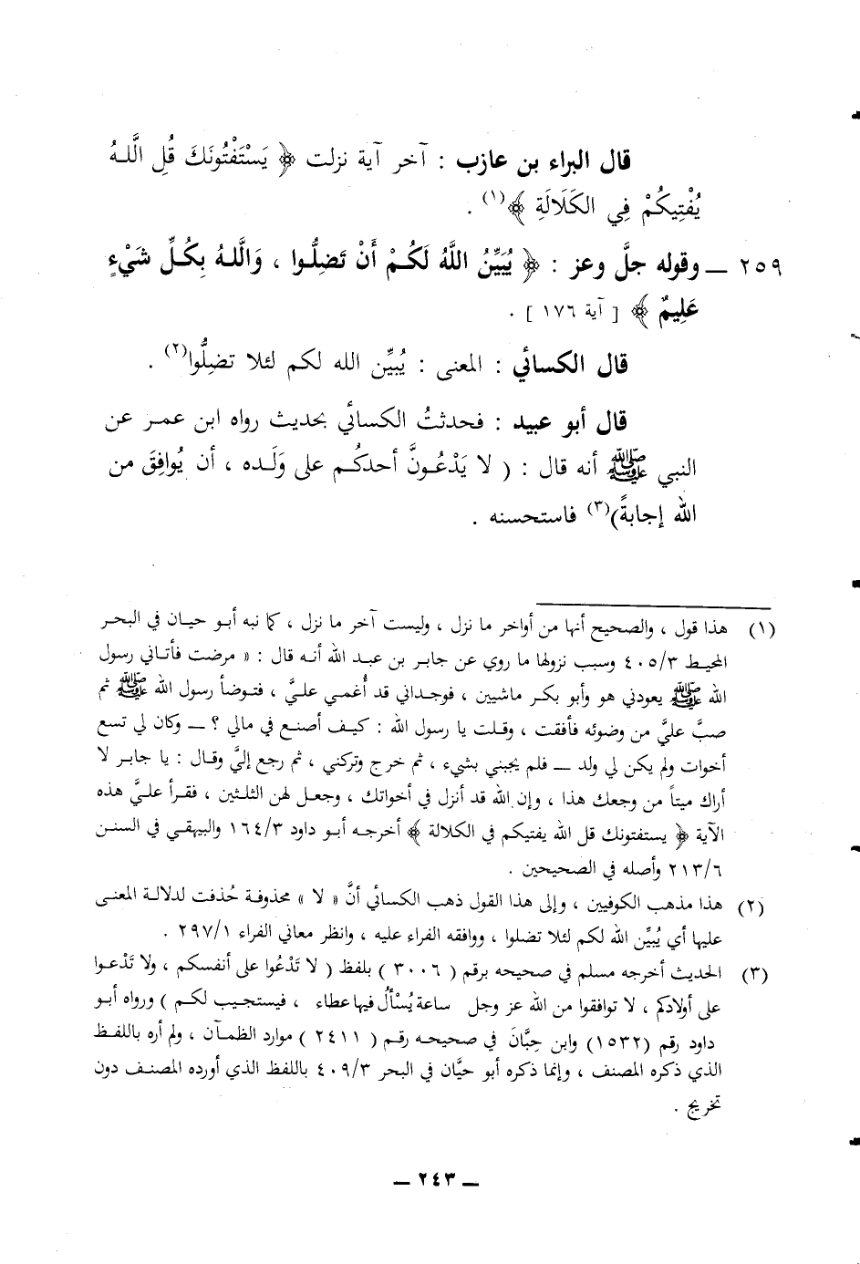 قال البراء بن عازب آخر آية نزلت (يستفتونك قل الله يفتيكم في الكلالة) 259 وقوله جل وعز (يبين الله لكم أن تضلوا والله بكل شئ