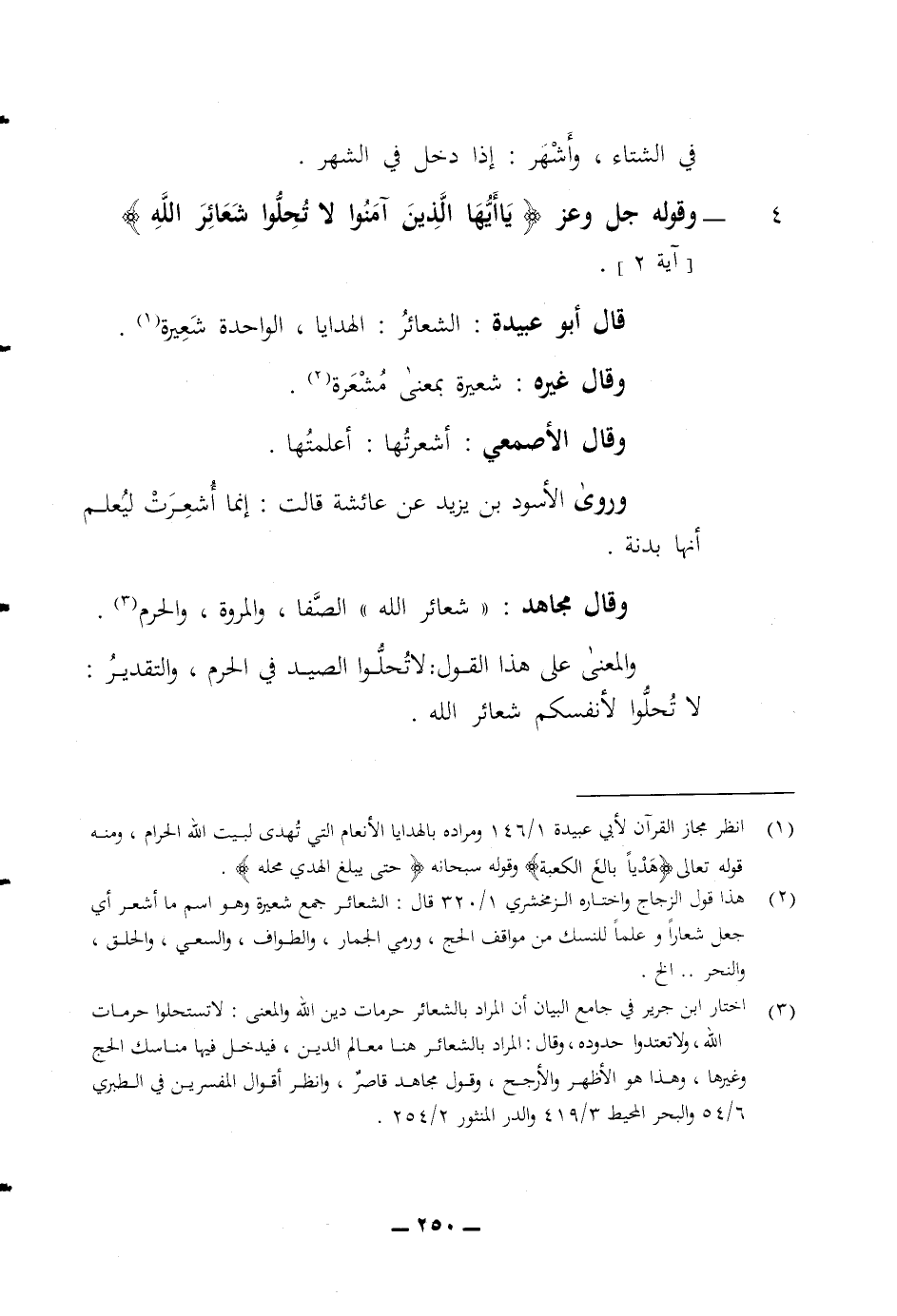 في الشتاء وأشهر إذا دخل في الشهر 4 وقوله جل وعز (يا أيها الذين آمنوا لا تحلوا شعائر الله) قال أبو عبيدة الشعائر الهدايا الواحدة شعيرة وقال غيره شعيرة بمعنى مشعرة وقال الاصمعي أشعرتها أهل أعلمتها وروى الاسود بن يزيد عن عائشة قالت انما أشعرت ليعلم أنها بدنة وقال مجاهد شعائر الله الصفا والمروة والحرم والمعنى على هذا القول لا تحلوا الصيد في الحرم والتقدير لا تحلوا لانفسكم شعائر الله