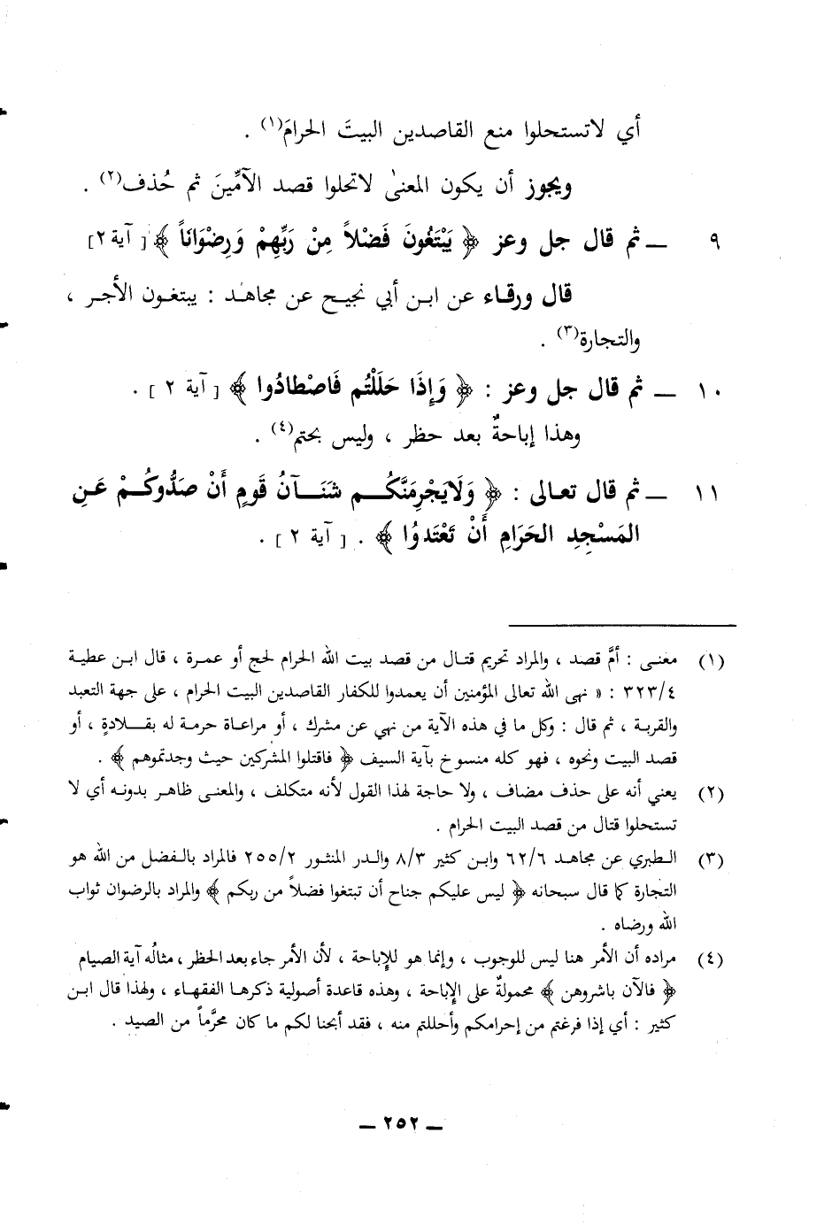أي لا تستحلوا منع القاصدين البيت الحرام ويجوز أن يكون المعنى لا تحلوا قصد الآمين ثم حذف 9 ثم قال جل وعز (يبتغون فضلا من ربهم ورضوانا) قال ورقاء عن ابن أبي نجيح عن مجاهد يبتغون الاجر والتجارة 10 ثم قال جل وعز (وإذا حللتم فاصطادوا) وهذا اباحة بعد حظر وليس بحتم 11 ثم قال تعالى (ولا يجرمنكم شنآن قوم أن صدوكم عن المسجد الحرام أن تعتدوا)