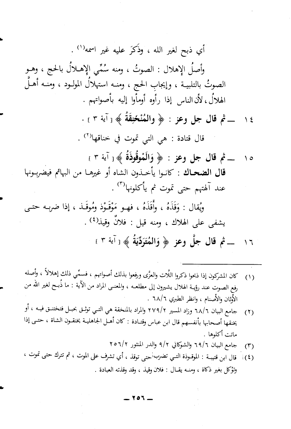 أي ذبح لغير الله وذكر عليه غير اسمه وأصل الاهلال الصوت ومنه سمي الاهلال بالحج وهو الصوت بالتلبية وايجاب الحج ومنه استهلال المولود ومنه أهل الهلال لان الناس إذا رأوه أومأوا إليه بأصواتهم 14 ثم قال جل وعز (المنخنقة) قال قتادة هي التي تموت في خناقها 15 ثم قال جل وعز (والموقوذة) قال الضحاك كانوا يأخذون الشاة أو غيرها من البهائم فيضربونها عند آلهتم حتى تموت ثم يأكلونها ويقال وقذه وأقذه لأنه فهو موقوذ وموقذ أخبرنا إذا ضربه حتى يشفى على الهلاك ومنه قيل فلان وقيذ 16 ثم قال جل وعز (والمتردية)
