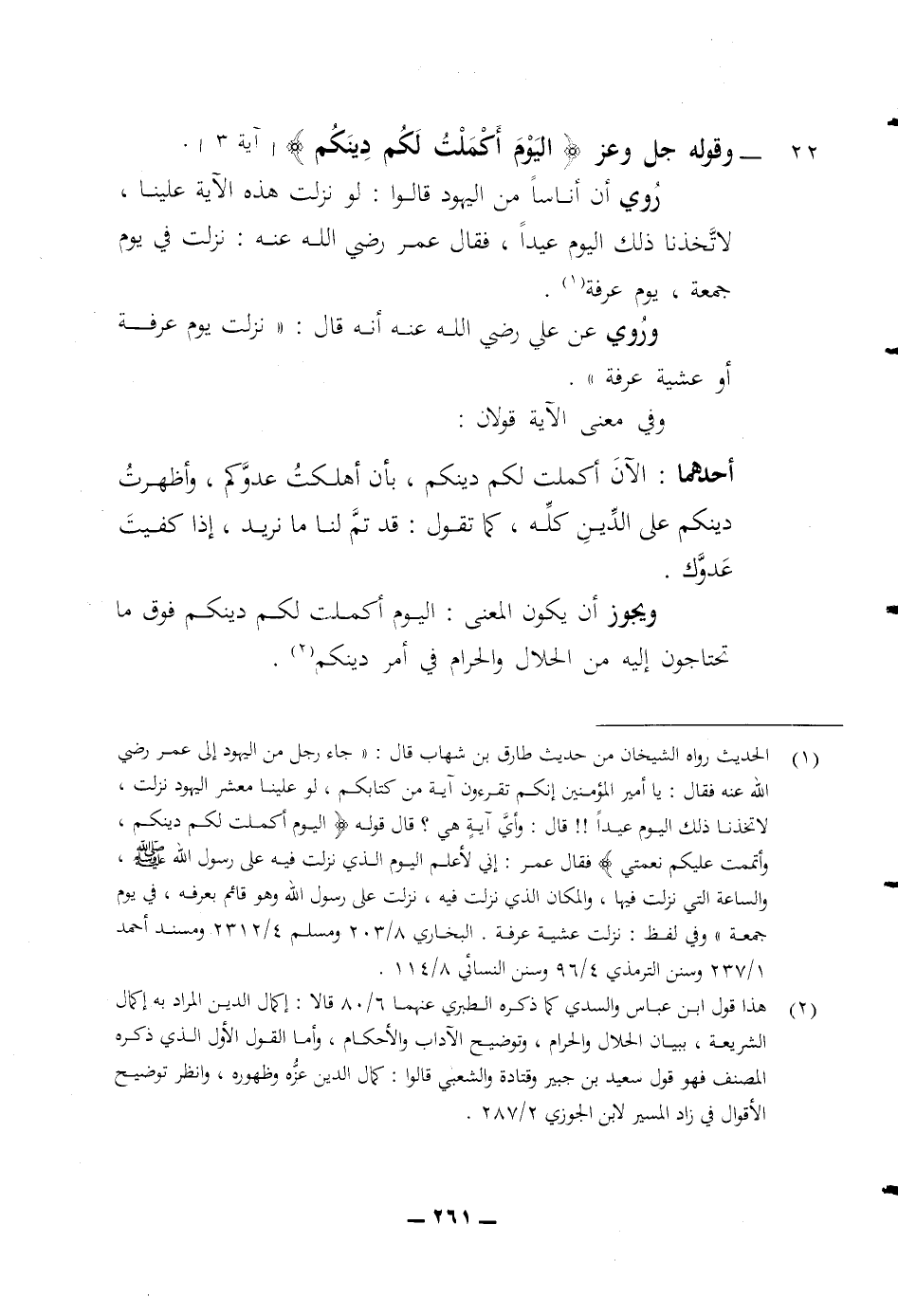22 وقوله جل وعز (اليوم أكملت لكم دينكم) روي أن أناسا من اليهود قالوا لو نزلت هذه الآية علينا لاتخذنا ذلك اليوم عيدا فقال عمر رضي لله عنه نزلت في يوم جمعة يوم عرفة وروي عن على رضي الله عنه أنه قال نزلت يوم عرفة أو عشية عرفة وفي معنى الآية قولان أحدهما الآن أكملت لكم دينكم بأن أهلكت عدوكم وأظهرت دينكم على الدين كله كما تقول قد تم لنا ما نريد إذا كفيت عدوك ويجوز أن يكون المعنى اليوم أكملت لكم دينكم فوق ما تحتاجون إليه من الحلال والحرام في أمر دينكم