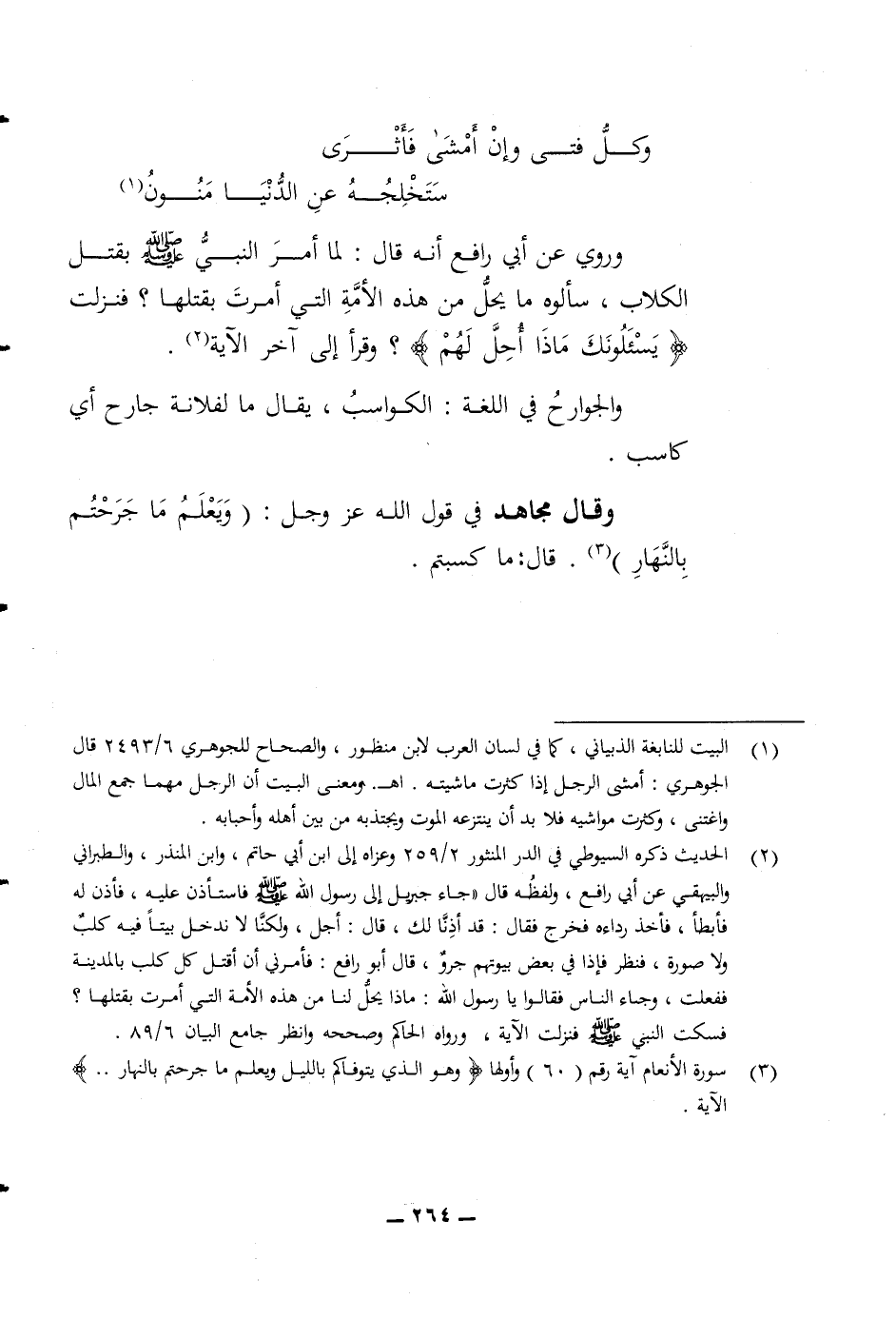 الكلاب سألوه ما يحل من هذه الامة التي أمرت بقتلها فنزلت (يسئلونك ماذا أحل لهم) وقرأ الى آخر الآية والجوارح في اللغة الكواسب يقال ما لفلانة جارح أي كاسب وقال مجاهد في قول الله عز وجل (ويعلم ما جرحتم بالنهار) قال ما كسبتم