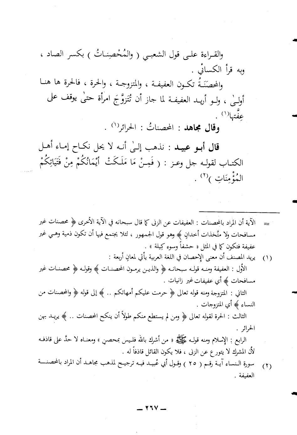 والقراءة على قول الشعبي والمحصنات بكسر الصاد وبه قرأ الكسائي والمحصنة تكون العفيفة والمتزوجة والحرة فالحرة ها هنا أولى ولو أريد العفيفة لما جاز أن تتزوج امرأة حتى يوقف على عفتها وقال مجاهد المحصنات الحرائر قال أبو عبيد نذهب الى أنه لا يحل نكاح اماء أهل الكتاب لقوله جل وعز (فمن ما ملكت أيمانكم من فتياتكم المؤمنات)