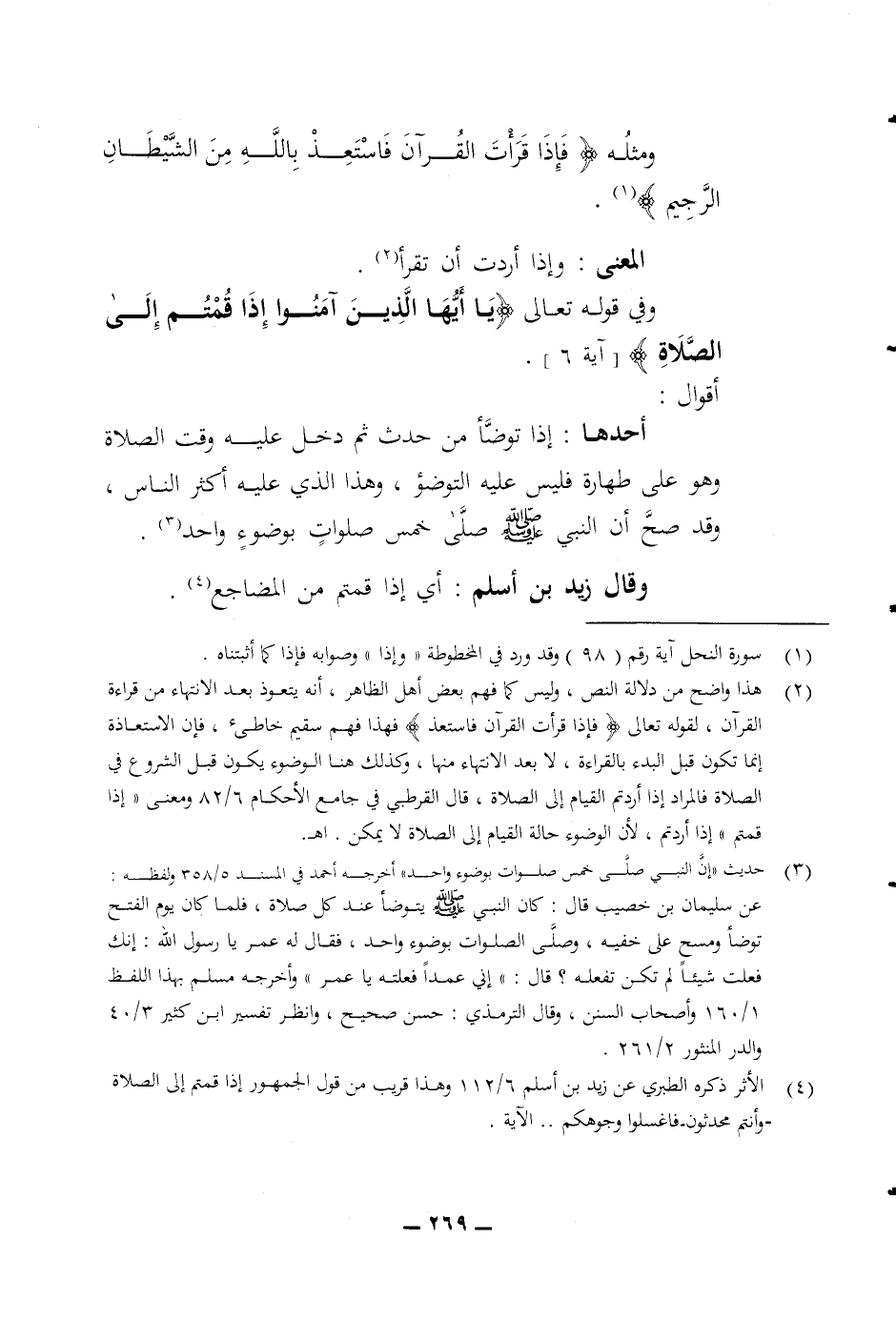 ومثله (فإذا قرأت القرآن فاستعذ بالله من الشيطان الرجيم) المعنى وإذا أردت أن تقرأ وفي قوله تعالى (يا أيها الذين آمنوا إذا قمتم الى الصلاة) أقوال أحدها إذا توضأ من حدث ثم دخل عليه وقت الصلاة وهو على طهارة فليس عليه التوضؤ وهذا الذي عليه أكثر الناس وقد صح أن النبي صلى الله عليه وسلم صلى خمس صلوات بوضوء واحد وقال زيد بن أسلم أي إذا قمتم من المضاجع