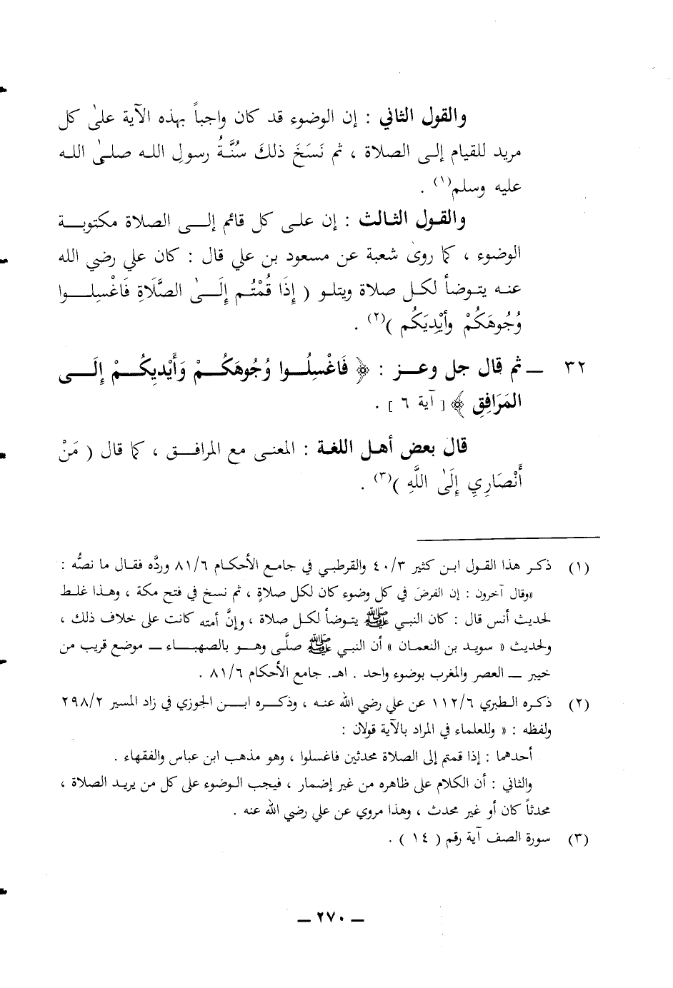عليه وسلم والقول الثالث ان على كل قائم الى الصلاة مكتوبة الوضوء كما روى شعبة عن مسعود بن علي قال كان علي رضي الله عنه يتوضأ لكل صلاة ويتلو (إذا قمتم الى الصلاة فاغسلوا وجوهكم وأيديكم) 32 ثم قال جل وعز (فاغسلوا وجوهكم وأيديكم الى المرافق) قال بعض أهل اللغة المعنى مع المرافق كما قال من أنصاري الى الله