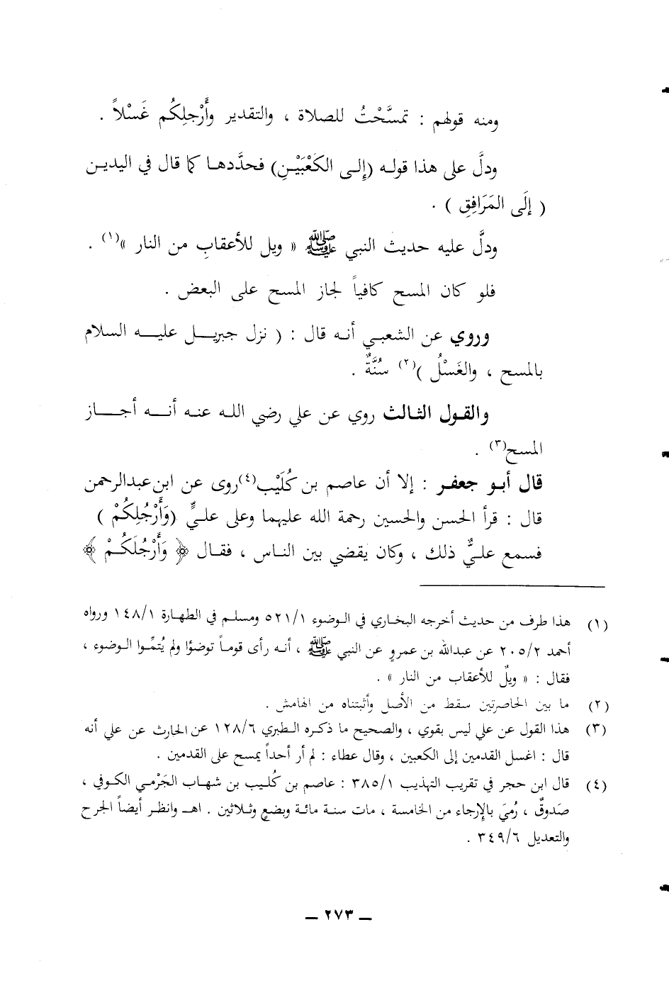 ومنه قولهم تمسحت للصلاة والتقدير وأرجلكم غسلا ودل على هذا قوله الى الكعبين فحددها كما قال في اليدين الى المرافق ودل عليه حديث النبي صلى الله عليه وسلم (ويل للاعقاب من النار) فلو كان المسح كافيا لجاز المسح على البعض وروي عن الشعبي أنه قال نزل جبريل عليه السلام بالمسح والغسل سنة والقول الثالث روي عن علي رضي الله عنه أنه أجاز المسح قال أبو جعفر الا أن عاصم بن كليب روى عن ابن عبد الرحمن قال قرأ الحسن والحسين رحمة الله عليهما وعلى علي وأرجلكم فسمع علي ذلك وكان يقضي بين الناس فقال وارجلكم