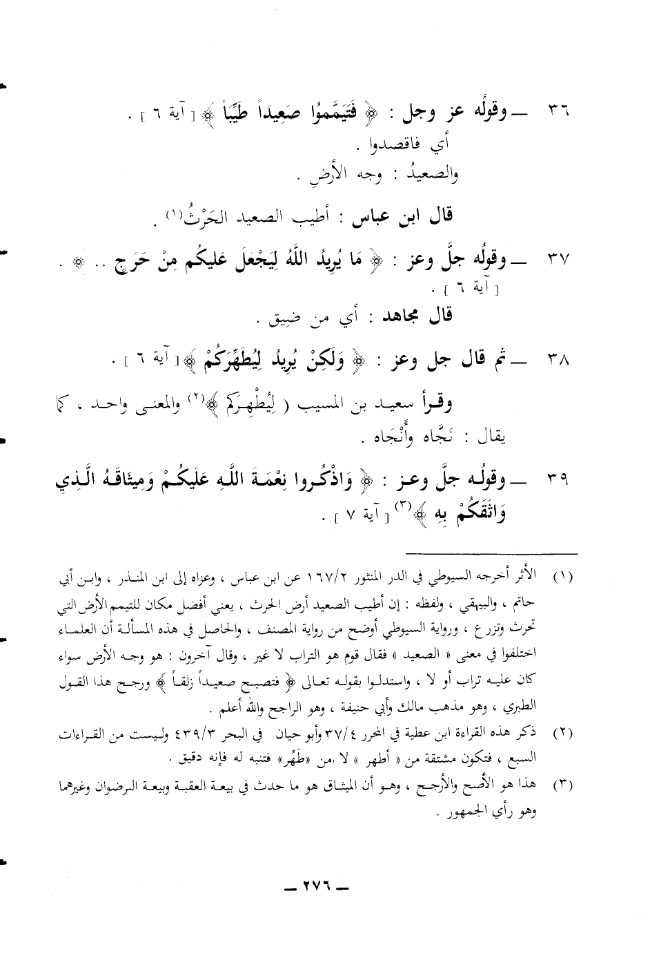 36 وقوله عز وجل (فتيمموا صعيدا طيبا) أي فاقصدوا والصعيد وجه الارض قال ابن عباس أطيب الصعيد الحرث 37 وقوله جل وعز (ما يريد الله ليجعل عليكم من حرج) قال مجاهد أي من ضيق 38 ثم قال جل وعز (ولكن يريد ليطهركم) وقراء سعيد بن المسيب ليطهركم والمعنى واحد كما يقال نجاه وأنجاه 39 وقوله جل وعز (واذكروا نعمة الله عليكم وميثاقه الذي واثقكم به)