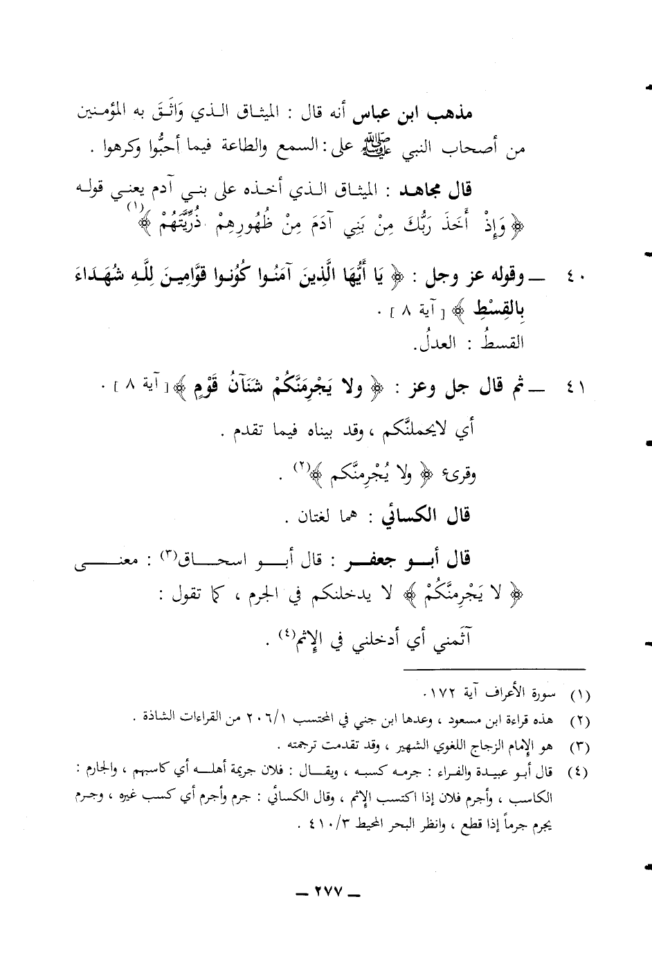 41 ثم قال جل وعز (ولا يجرمنكم شنآن قوم) أي لا يحملنكم وقد بيناه فيما تقدم وقرئ (ولا يجرمنكم) قال الكسائي هما لغتان قال أبو جعفر قال أبو اسحاق معنى لا يجرمنكم لا يدخلنكم في الجرم كما تقول آثمني أي أدخلني في الاثم