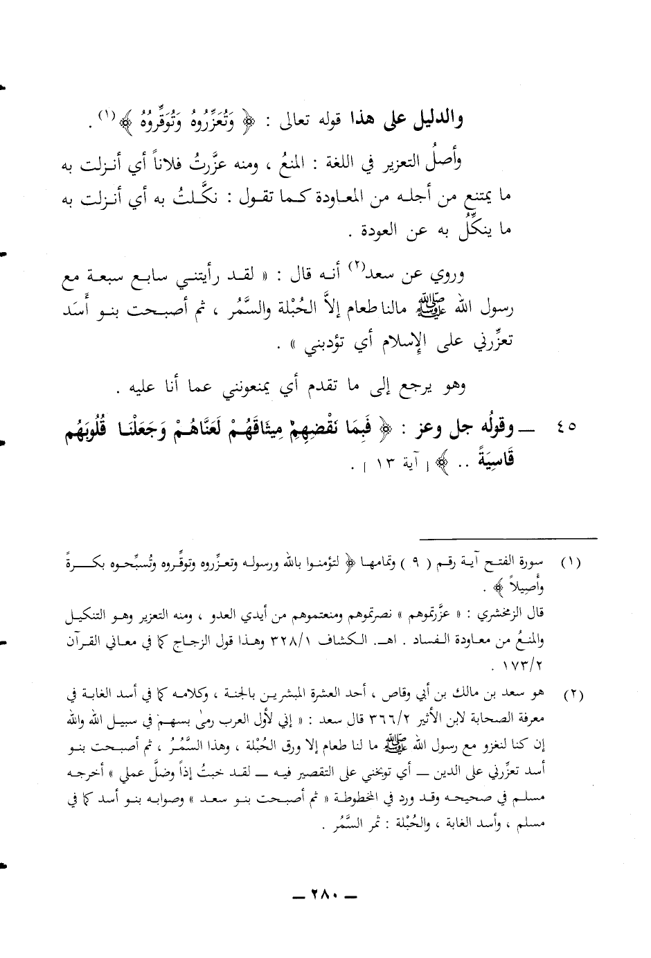 والدليل على هذا قوله تعالى (وتعزروه وتوقروه) وأصل التعزير في اللغة المنع ومنه عزرت فلانا أي أنزلت به ما يمتنع من أجله من المعاودة كما تقول نكلت به أي أنزلت به ما ينكل به عن العودة وروي عن سعد أنه قال لقد رأيتني سابع سبعة مع رسول الله صلى الله عليه وسلم ما لنا طعام الا الحبلة والسمر ثم أصبحت بنو أسد تعزرني على الاسلام أي تؤدبني وهو يرجع الى ما تقدم أي يمنعونني سعيد عما أنا عليه 45 وقوله جل وعز (فبما نقضهم ميثاقهم لعناهم وجعلنا قلوبهم قاسية)