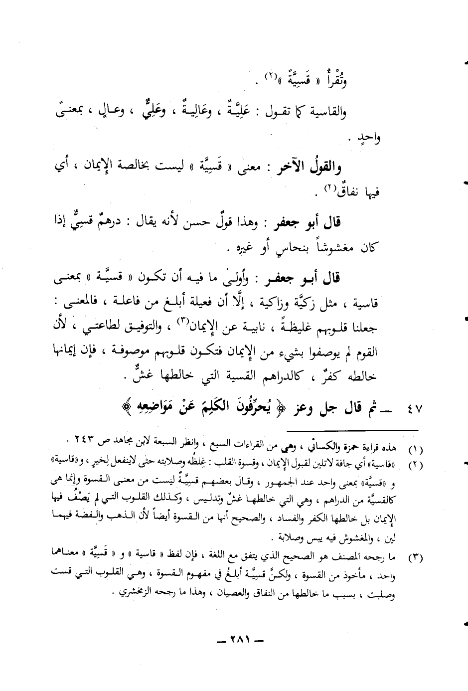 فيها نفاق قال أبو جعفر وهذا قول حسن لأنه يقال درهم قسي إذا كان مغشوشا بنحاس أو غيره قال أبو جعفر وأولى ما فيه أن تكون (قسية) بمعنى قاسية مثل زكية وزاكية الا أن فعيلة أبلغ من فاعلة فالمعنى جعلنا قلوبهم غليظة نابية عن الايمان والتوفيق لطاعتي لان القوم لم يوصفوا بشئ من الايمان فتكون قلوبهم موصوفة فان ايمانها خالطه كفر كالدراهم القسية التي خالطها غش 47 ثم قال جل وعز (يحرفون الكلم عن مواضعه)