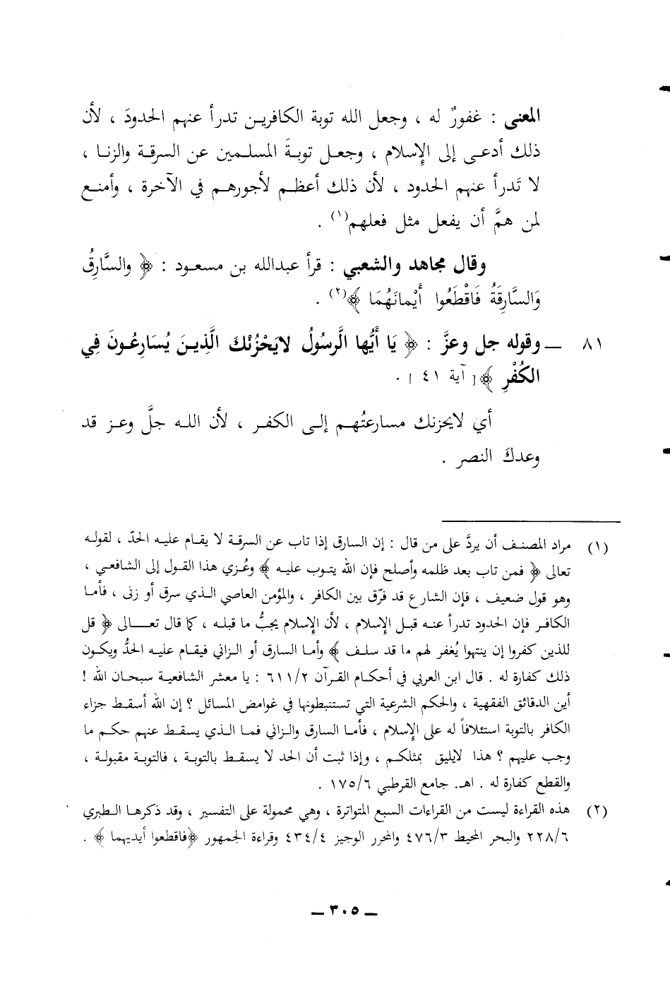 لا تدرأ عنهم الحدود لان ذلك أعظم لاجورهم في الآخرة وأمنع لمن هم أن يفعل مثل فعلهم وقال مجاهد والشعبي قرأ عبد الله بن مسعود (والسارق والسارقة فاقطعوا أيمانهما) 81 وقوله جل وعز (يا أيها الرسول لا يحزنك الذين يسارعون في الكفر) أي لا يحزنك مسارعتهم الى الكفر لان الله جل وعز قد وعدك النصر