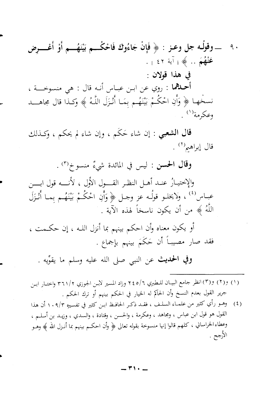 قال ابراهيم وقال الحسن ليس في المائدة شئ منسوخ والاختيار عند أهل النظر القول الاول لانه قول ابن عباس ولا يخلو قوله عز وجل (وأن احكم بينهم بما أنزل الله) من أن يكون ناسخا لهذه الآية أو يكون معناه وأن احكم بينهم بما أنزل الله ان حكمت فقد صار مصيبا أن حكم بينهم باجماع وفي الحديث عن النبي صلى الله عليه وسلم ما يقويه