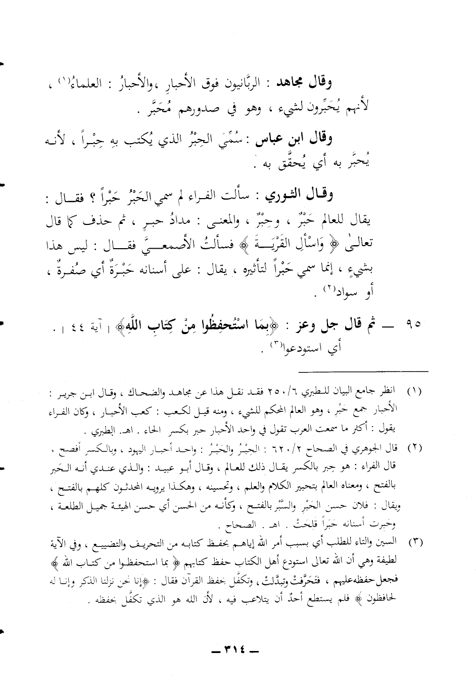 وقال ابن عباس سمي الحبر الذي يكتب به حبرا لانه يحبر به أي يحقق به وقال الثوري سألت الفراء لم سمي الحبر حبرا فقال يقال للعالم حبر وحبر والمعنى مداد حبر ثم حذف كما قال تعالى (واسأل القرية) فسألت الاصمعي فقال ليس هذا بشئ انما سمي حبرا لتأثيره يقال على أسنانه حبرة أي صفرة أو سواد 95 ثم قال جل وعز (بما استحفظوا من كتاب الله) أي استودعوا