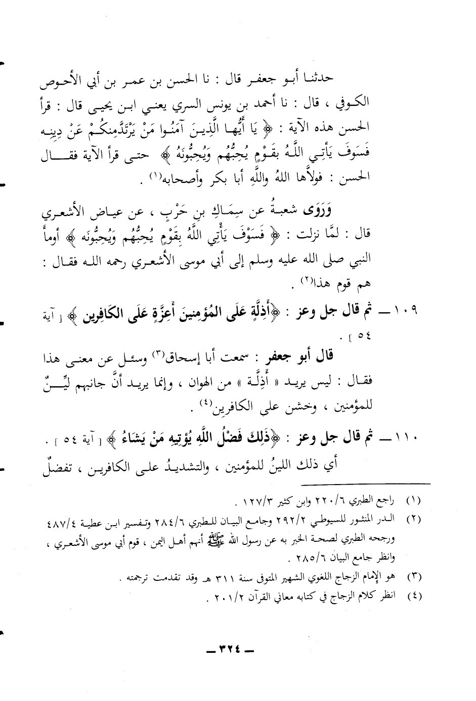 حدثنا أبو جعفر قال نا الحسن بن عمر بن أبي الاحوص الكوفي قال نا أحمد بن يونس السري يعني ابن يحيى قال قرأ الحسن هذه الآية (يا أيها الذين آمنوا من يرتد منكم عن دينه فسوف يأتي الله بقوم يحبهم ويحبونه) حتى قرأ الآية فقال الحسن فولاها الله والله أبا بكر وأصحابه وروى شعبة عن سماك بن حرب عن عياض الاشعري قال لما نزلت (فسوف يأتي الله بقوم يحبهم ويحبونه) أوما النبي صلى الله عليه وسلم الى أبي موسى الاشعري رحمه الله فقال هم قوم هذا 109 ثم قال جل وعز (أذلة على المؤمنين أعزة على الكافرين) قال أبو جعفر سمعت أبا اسحاق وسئل عن معنى هذا فقال ليس يريد أذلة من الهوان وانما يريد أن جانبهم لين للمؤمنين وخشن على الكافرين
