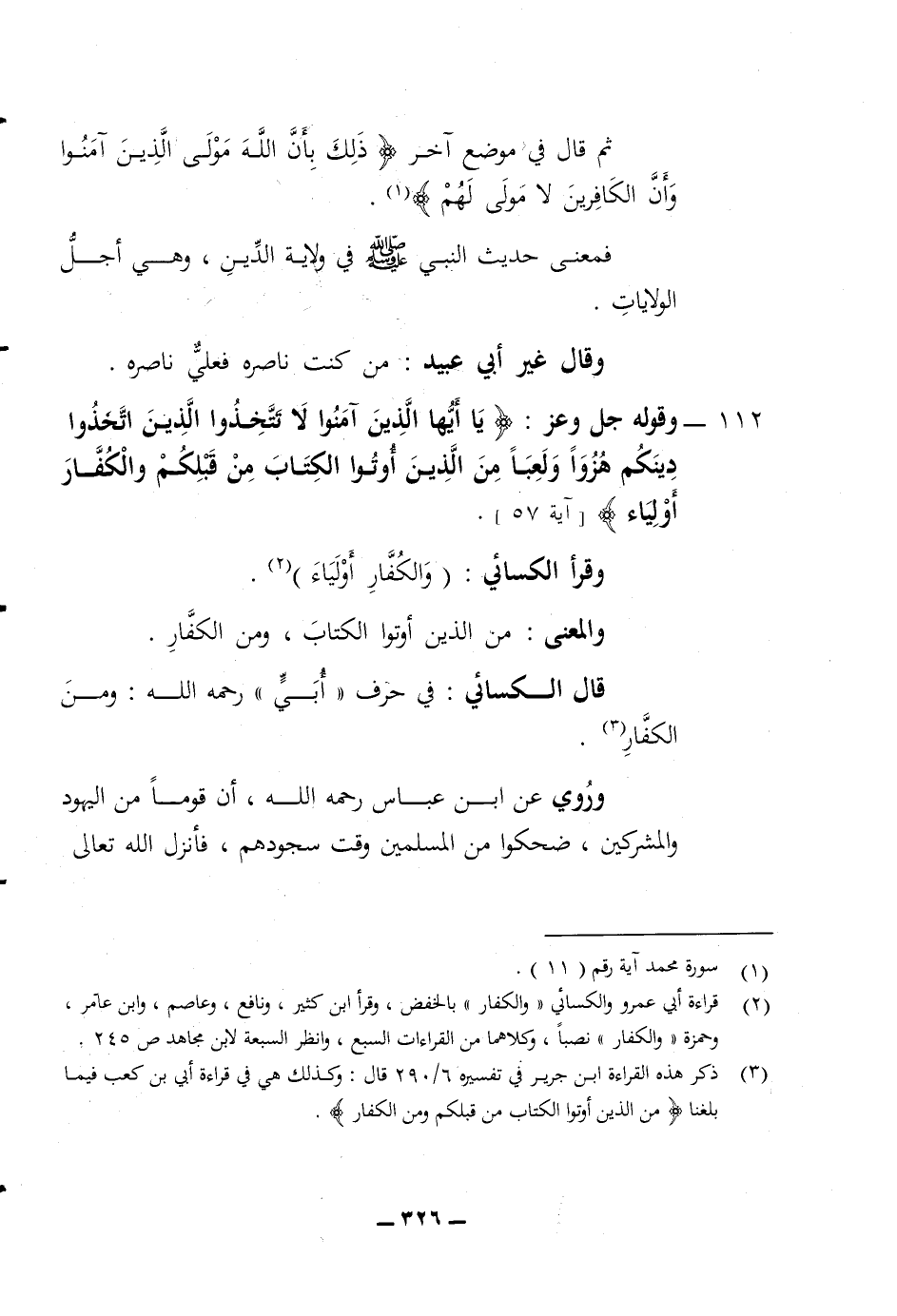 ثم قال في موضع آخر (ذلك بأن الله مولى الذين آمنوا وأن الكافرين لا مولى لهم) فمعنى حديث النبي صلى الله عليه وسلم في ولاية الدين وهي أجل الولايات وقال غير أبي عبيد من كنت ناصره فعلي ناصره 112 وقوله جل وعز (يا أيها الذين آمنوا لا تتخذوا الذين اتخذوا دينكم هزوا ولعبا من الذين أوتوا الكتاب من قبلكم والكفار