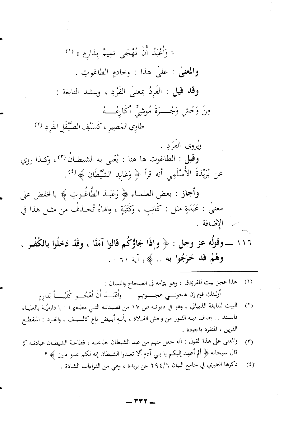 (وأعبد أن تهجى تميم بدارم) والمعنى على هذا وخادم الطاغوت وقد قيل الفرد بمعنى الفرد وينشد النابغة من وحش وجرة موشي أكارعه طاوي المصير كسيف الصيقل الفرد ويروى الفرد وقيل الطاغوت ها هنا يعنى به الشيطان وكذا روي عن بريدة الاسلمي أنه قرأ (وعابد الشيطان) وأجاز بعض العلماء (وعبد الطاغوت) بالخفض على معنى عبدة مثل كاتب وكتبة والهاء تحذف من مثل هذا في الاضافة 116 وقوله عز وجل (وإذا جاؤكم قالوا آمنا وقد دخلوا بالكفر وهم قد خرجوا به)