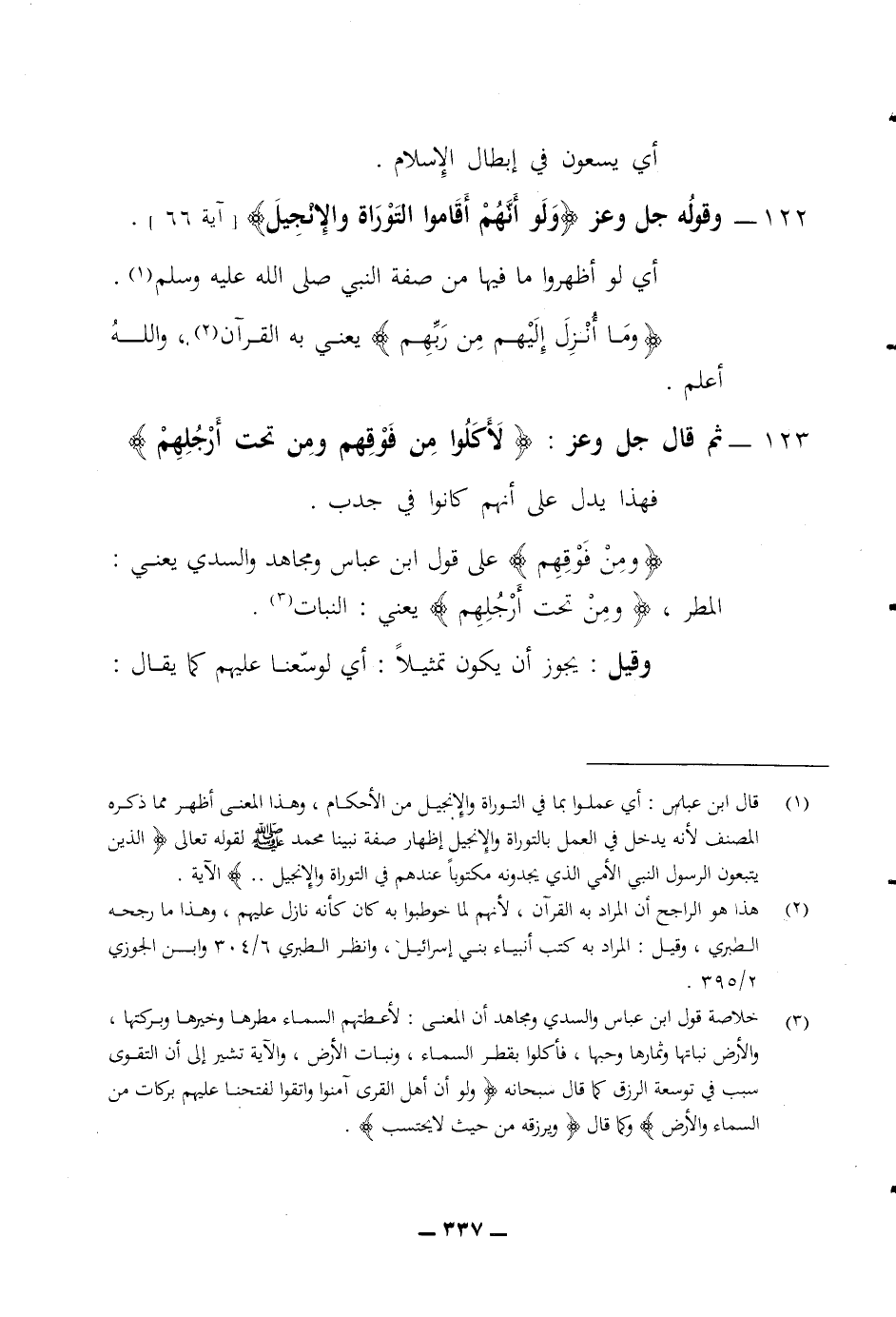 أي يسعون في إبطال الاسلام 122 وقوله جل وعز (ولو أنهم أقاموا التوراة والانجيل) أي لو أظهروا ما فيها من صفة النبي صلى الله عليه وسلم (وما أنزل إليهم من ربهم) يعني به القرآن والله أعلم 123 ثم قال جل وعز (لاكلوا من فوقهم ومن تحت أرجلهم) فهذا يدل على أنهم كانوا في جدب