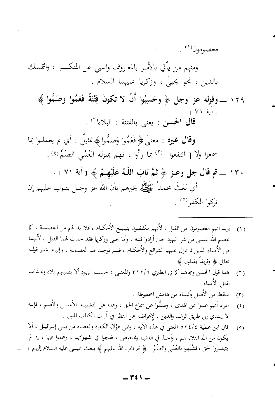 معصومون ومنهم من يأتي بالامر بالمعروف والنهي عن المنكر والتمسك بالدين نحو يحيى وزكريا عليهما السلام 129 وقوله عز وجل (وحسبوا أن لا تكون فتنة فعموا وصموا) قال الحسن يعني بالفتنة البلاء وقال غيره معنى (فعموا وصموا) تمثيل أي لم يعملوا بما سمعوا ولا انتفعوا بما رأوا فهم بمنزلة العمي الصم 130 ثم قال جل وعز (ثم تاب الله عليهم) أي بعث محمدا صلى الله عليه وسلم يخبرهم بأن الله عز وجل يتوب عليهم ان تركوا الكفر