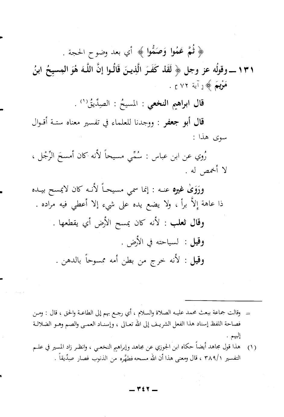 (ثم عمو وصموا) أي بعد وضوح الحجة 131 وقوله عز وجل (لقد كفر الذين قالوا ان الله هو المسيح ابن مريم) قال ابراهيم النخعي المسيح الصديق قال أبو جعفر ووجدنا للعلماء في تفسير معناه ستة أقوال سوى هذا روي عن ابن عباس سمي مسيحا لانه كان أمسح الرجل لا أخمص له وروى غيره عنه انما سمي مسيحا لانه كان لا يمسح بيده ذا عاهة الا برأ ولا يضع يده على شئ الا أعطي فيه مراده
