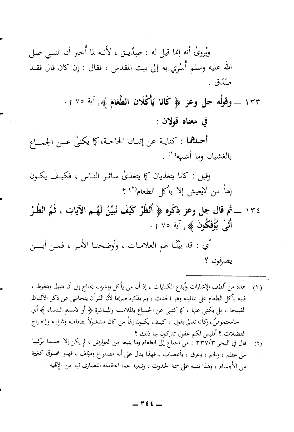 ويروى أنه انما قيل له صديق لانه لما أخبر أن النبي صلى الله عليه وسلم أسري به الى بيت المقدس فقال ان كان قال فقد صدق 133 وقوله جل وعز (كانا يأكلان الطعام) في معناه قولان أحدهما كناية عن اتيان الحاجة كما يكنى عن الجماع بالغشيان وما أشبهه وقيل كانا يتغذيان كما يتغذى سائر الناس فكيف يكون