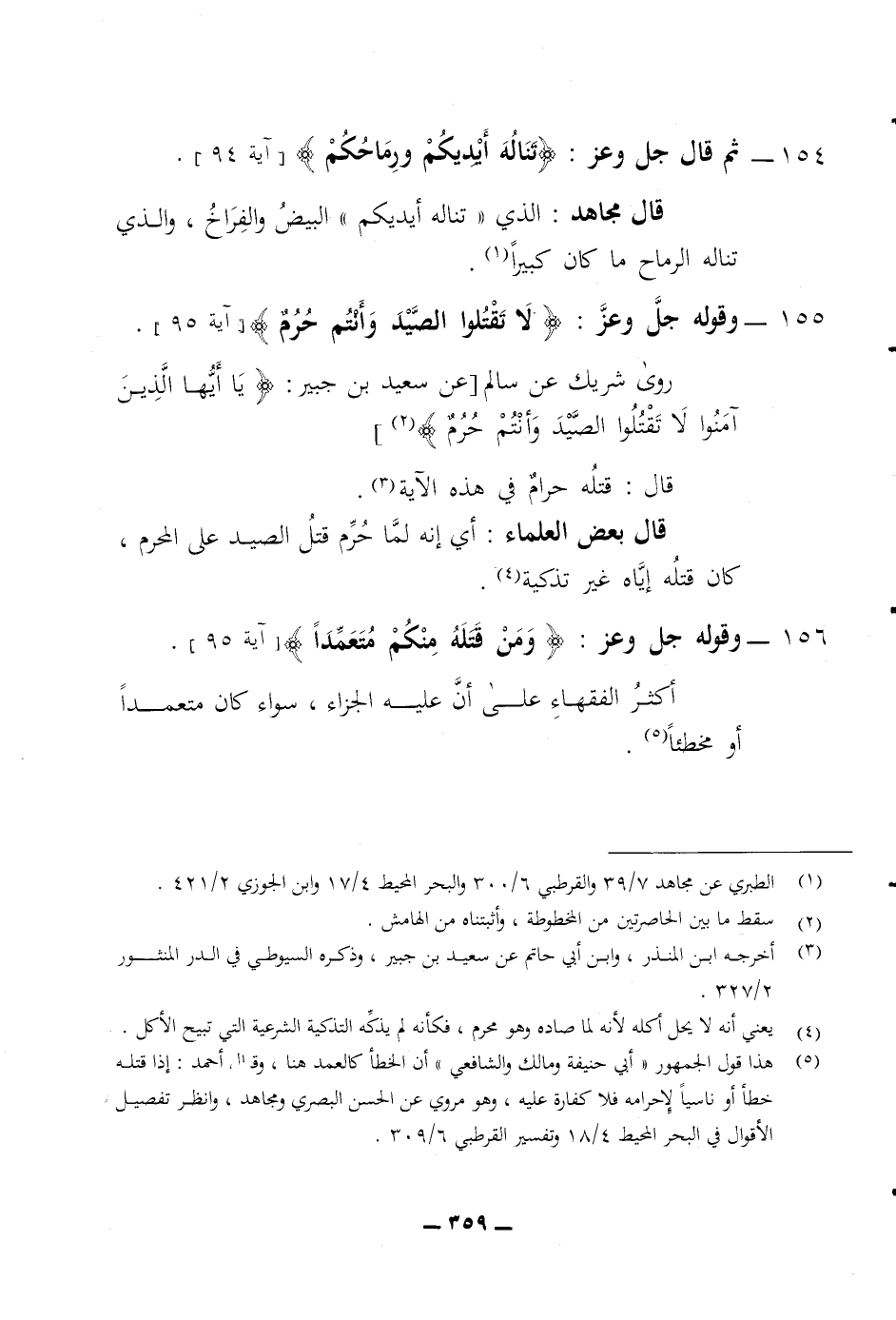 154 ثم قال جل وعز (تناله أيديكم ورماحكم) قال مجاهد الذي تناله أيديكم البيض والفراخ والذي تناله الرماح ما كان كبيرا