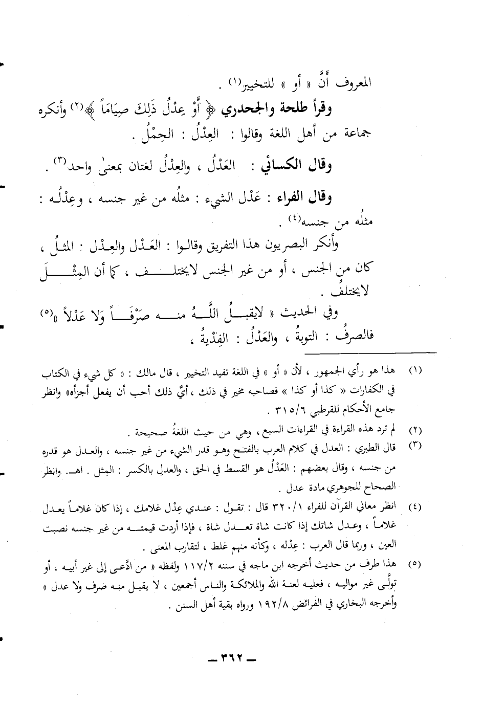 المعروف أن أو للتخيير وقرأ طلحة والجحدري (أو عدل ذلك صياما) وأنكره جماعة من أهل اللغة وقالوا العدل الحمل وقال الكسائي العدل والعدل لغتان بمعنى واحد وقال الفراء عدل الشئ مثله من غير جنسه وعدله مثله من جنسه وأنكر البصريون هذا التفريق وقالوا العدل والعدل المثل كان من الجنس أو من غير الجنس لا يختلف كما أن المثل