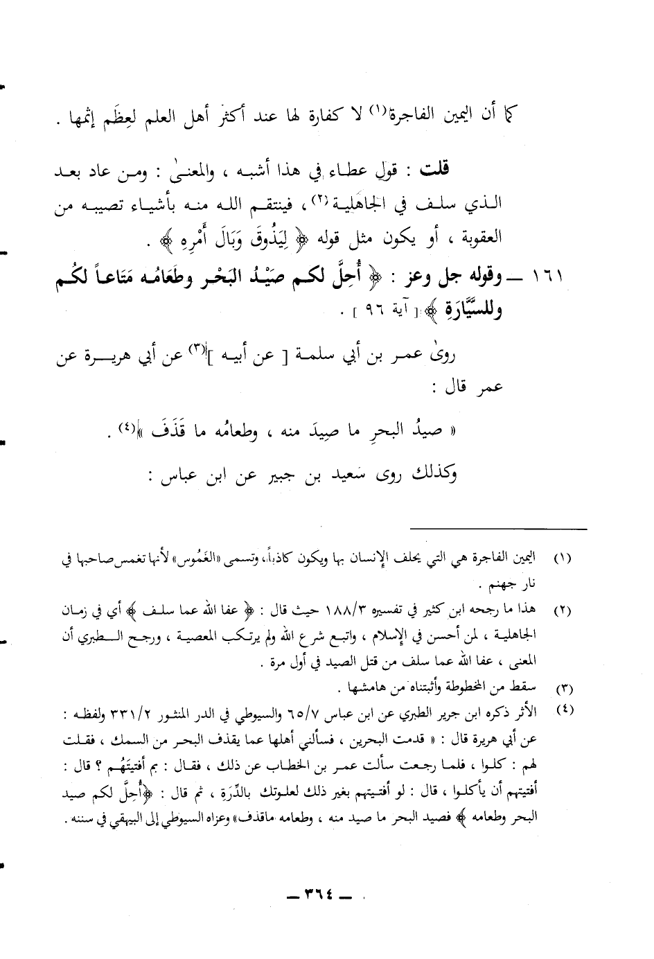 كما أن اليمين الفاجرة لا كفارة لها عند أكثر أهل العلم لعظم اثمها قلت قول عطاء في هذا أشبه والمعنى ومن عاد بعد الذي سلف في الجاهلية فينتقم الله منه بأشياء تصيبه من العقوبة أو يكون مثل قوله (ليذوق وبال أمره) 161 وقوله جل وعز (أحل لكم صيد البحر وطعامه متاعا لكم