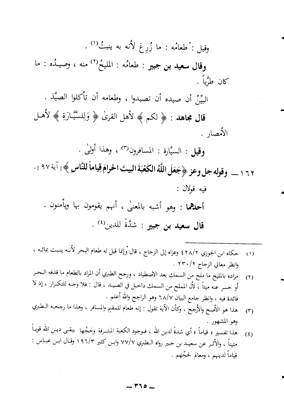 وقيل طعامه ما زرع لانه به ينبت وقال سعيد بن جبير طعامه المليح منه وصيده ما كان طريا البين أن صيده أن تصيدوا وطعامه أن تأكلوا الصيد قال مجاهد (لكم) لاهل القرى) (وللسيارة) لاهل الامصار وقيل السيارة المسافرون وهذا أولى 162 وقوله جل وعز (جعل الله الكعبة البيت الحرام قياما للناس) فيه قولان أحدهما وهو أشبه بالمعنى أنهم يقومون بها ويأمنون قال سعيد بن جبير شدة للدين
