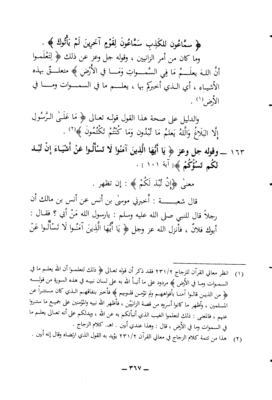 (سماعون للكذب سماعون لقوم آخرين لم يأتوك) وما كان من أمر الزانيين وقوله جل وعز عن ذلك (لتعلموا أن الله يعلم ما في السموات وما في الارض) متعلق بهذه الاشياء أي الذي أخبركم بها يعلم ما في السموات وما في الارض والدليل على صحة هذا القول قوله تعالى (ما على الرسول الا البلاغ والله يعلم ما تبدون وما كنتم تكتمون) 163 وقوله جل وعز (يا أيها الذين آمنوا لا تسألوا عن أشياء ان تبد لكم تسؤكم) معنى (ان تبد لكم) ان تظهر قال شعبة أخبرني موسى بن أنس بن مالك أن رجلا قال للنبي صلى الله عليه وسلم يا رسول الله من أبي فقال أبوك فلان فأنزل الله عز وجل (يا أيها الذين آمنوا لا تسألوا عن