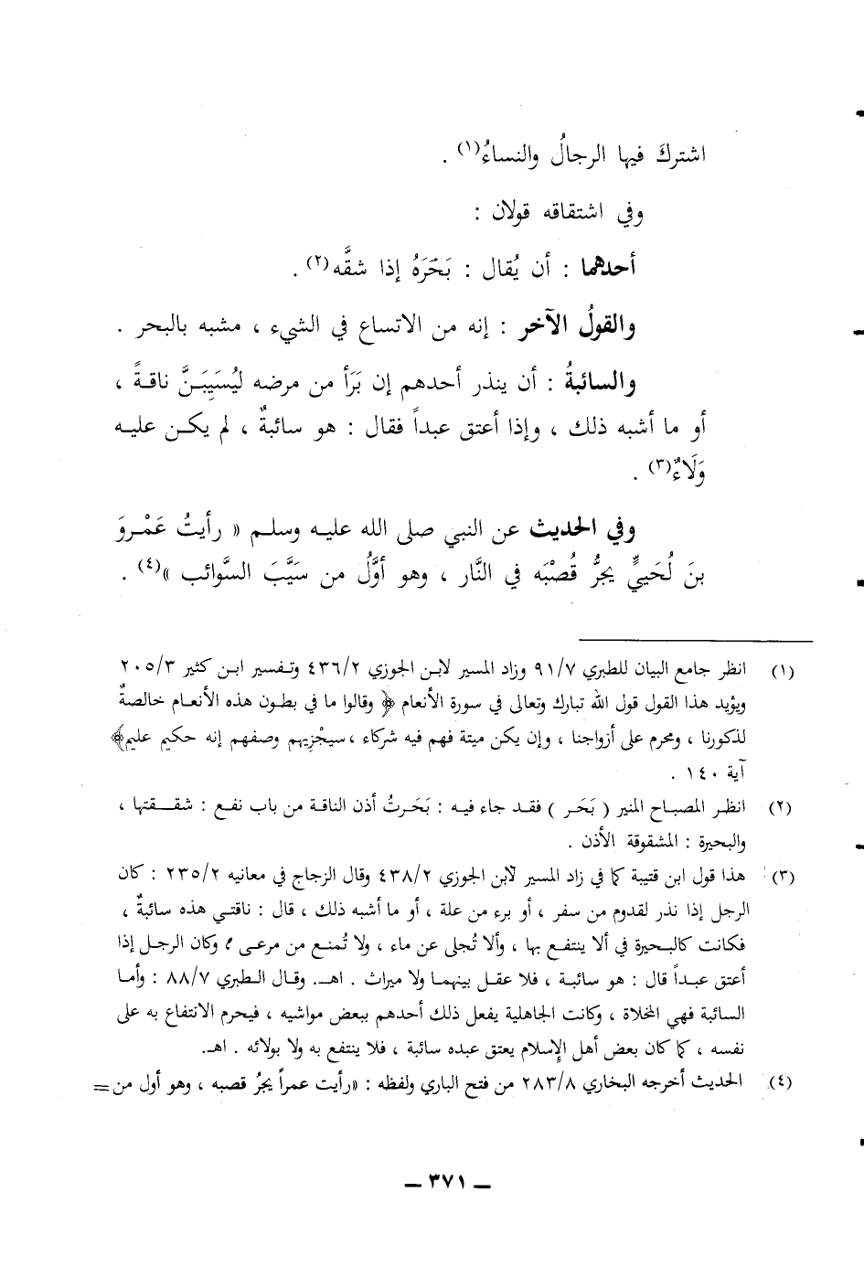 اشترك فيها الرجال والنساء وفي اشتقاقه قولان أحدهما أن يقال بحره إذا شقه والقول الآخر انه من الاتساع في الشئ مشبه بالبحر والسائبة أن ينذر أحدهم ان برأ من مرضه ليسيبن ناقة أو ما أشبه ذلك وإذا أعتق عبدا فقال هو سائبة لم يكن عليه ولاء