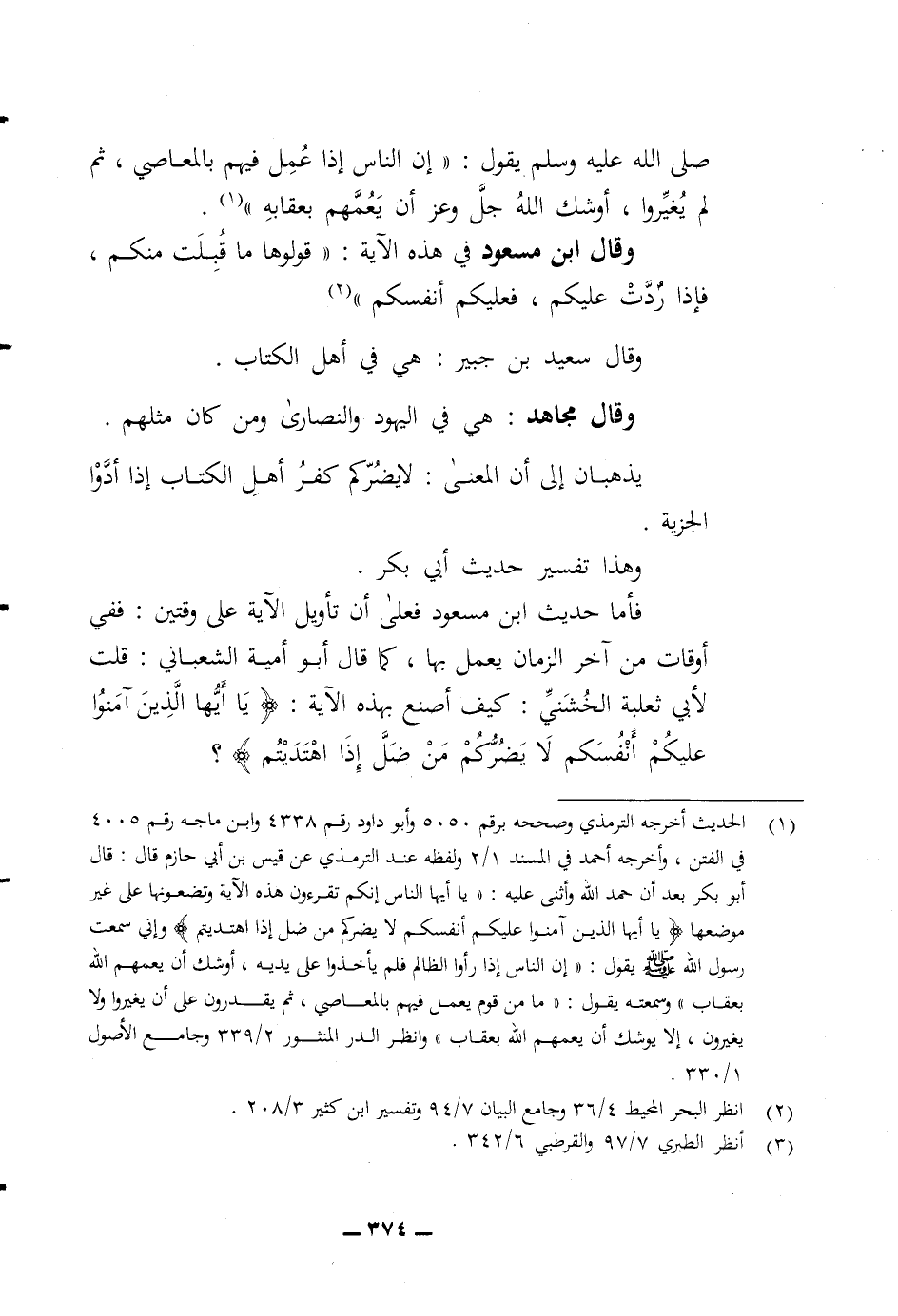 صلى الله عليه وسلم يقول (ان الناس إذا عمل فيهم بالمعاصي ثم لم يغيروا أوشك الله جل وعز أن يعمهم بعقابه) وقال ابن مسعود في هذه الآية قولوها ما قبلت منكم فإذا ردت عليكم فعليكم أنفسكم وقال سعيد بن جبير هي في أهل الكتاب وقال مجاهد هي في اليهود والنصارى ومن كان مثلهم يذهبان الى أن المعنى لا يضركم كفر أهل الكتاب إذا أدوا الجزية وهذا تفسير حديث أبي بكر فأما حديث ابن مسعود فعلى أن تأويل الآية على وقتين ففي أوقات من آخر الزمان يعمل بها كما قال أبو أمية الشعباني قلت لابي ثعلبة الخشني كيف أصنع بهذه الآية (يا أيها الذين آمنوا عليكم أنفسكم لا يضركم من ضل إذا اهتديتم)