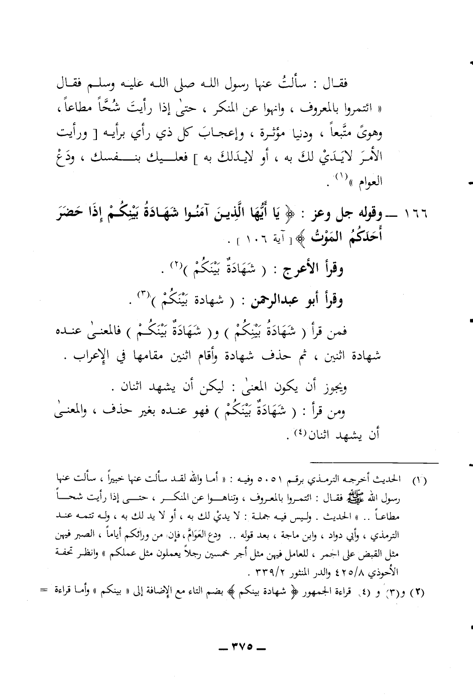 (ائتمروا بالمعروف وانهوا عن المنكر حتى إذا رأيت شحا مطاعا وهو متبعا ودنيا مؤثرة واعجاب كل ذي رأي برأيه ورأيت الامر لا يدي لك به أو لا يد لك به فعليك بنفسك ودع العوام 166 وقوله جل وعز (يا أيها الذين آمنوا شهادة بينكم إذا حضر أحدكم الموت) وقرأ الاعرج (شهادة بينكم) وقرأ أبو عبد الرحمن (شهادة بينكم) فمن قرأ (شهادة بينكم) و (شهادة بينكم) فالمعنى عنده شهادة اثنين ثم حذف شهادة وأقام اثنين مقامها في الاعراب ويجوز أن يكون المعنى ليكن أن يشهد اثنان ومن قرأ (شهادة بينكم) فهو عنده بغير حذف والمعنى أن يشهد اثنان