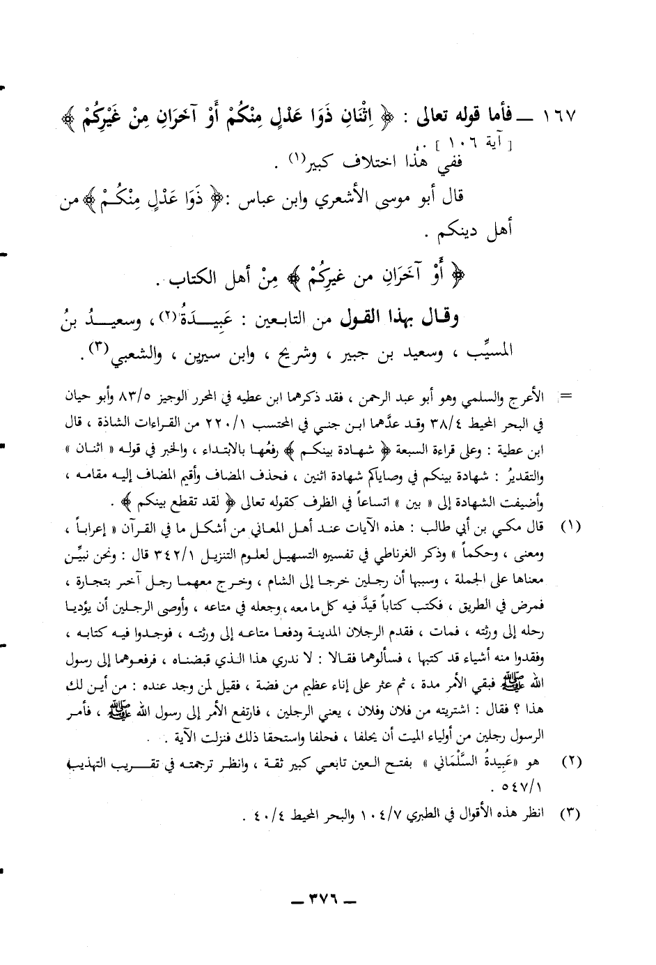 167 فأما قوله تعالى (اثنان ذوا عدل منكم أو آخران من غيركم) ففي هذا اختلاف كبير قال أبو موسى الاشعري وابن عباس (ذو عدل منكم) من أهل دينكم (أو آخران من غيركم) من أهل الكتاب وقال بهذا القول من التابعين عبيدة وسعيد بن المسيب وسعيد بن جبير وشريح وابن سيرين والشعبي