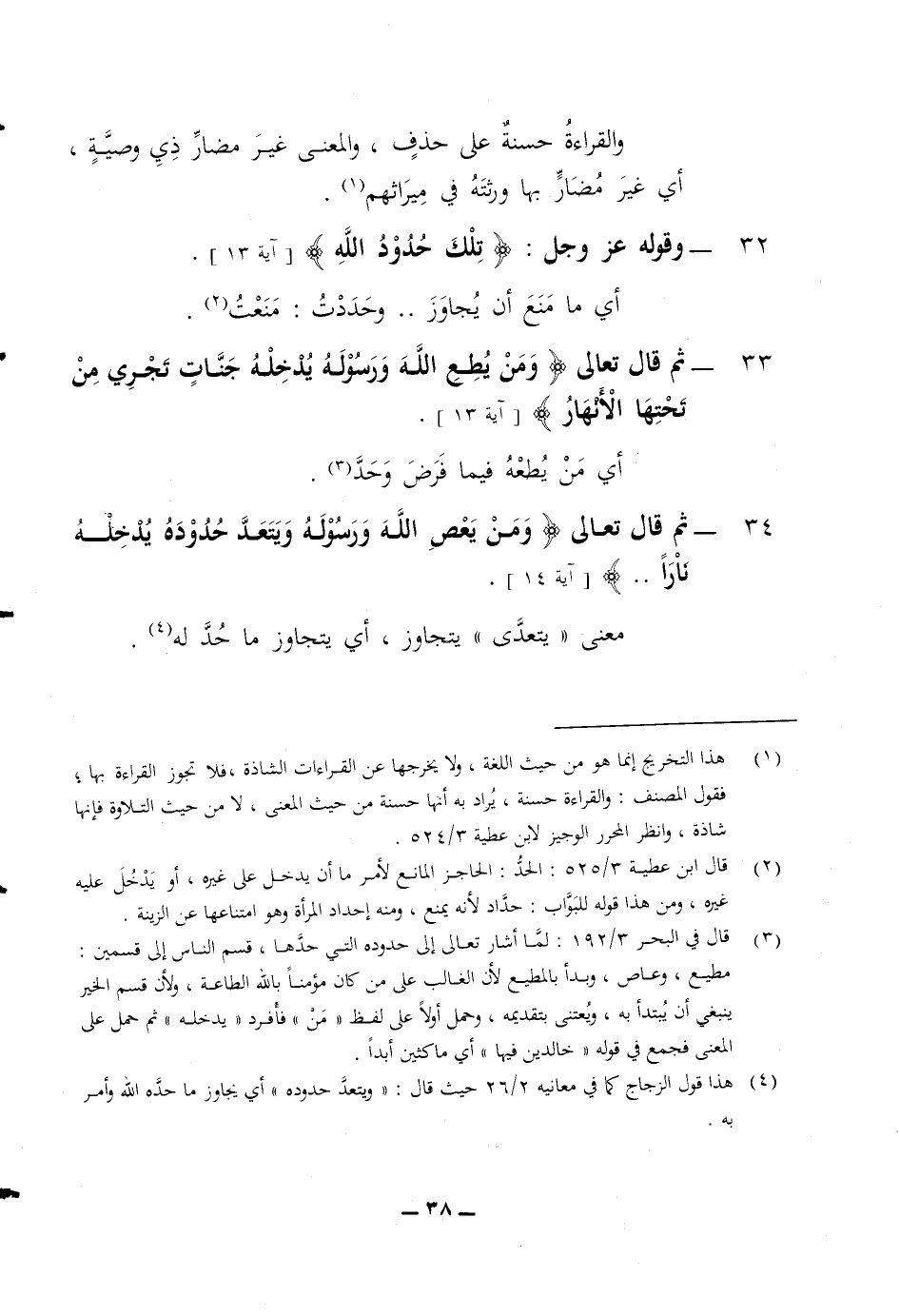 والقراءة حسنة على حذف والمعنى غير مضار ذي وصية أي غير مضار بها ورثته في ميراثهم 32 وقوله عز وجل (تلك حدود الله) أي ما منع أن يجاوز وحددت منعت 33 ثم قال تعالى (ومن يطع الله ورسوله يدخله جنات تجري من تحتها الانهار) أي من يطعه فيما فرض وحد 34 ثم قال تعالى (ومن يعص الله ورسوله ويتعد حدوده يدخله نارا) معنى يتعدى يتجاوز أي يتجاوز ما حد له