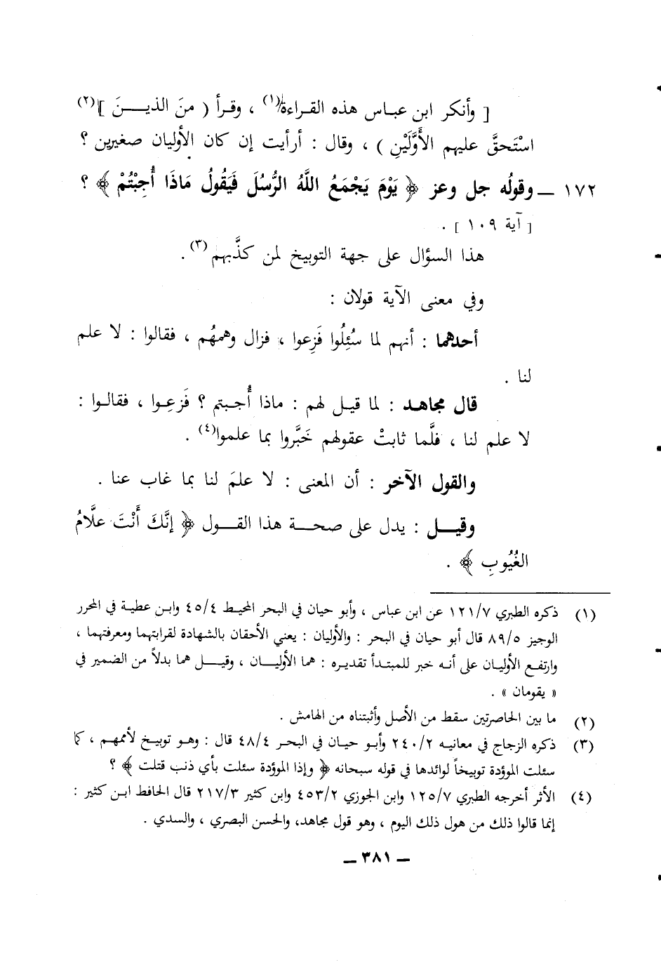 وأنكر ابن عباس هذه القراءة وقرأ (من الذين استحق عليهم الاولين) وقال أرأيت ان كان الاوليان صغيرين 172 وقوله جل وعز (يوم يجمع الله الرسل فيقول ماذا أجبتم) هذا السؤال على جهة التوبيخ لمن كذبهم وفي معنى الآية قولان أحدهما أنهم لما سئلوا فزعوا فزال وهمهم فقالوا لا علم لنا قال مجاهد لما قيل لهم ماذا أجبتم فزعوا فقالوا لا علم لنا فلما ثابت عقولهم خبروا بما علموا والقول الآخر أن المعنى لا علم لنا بما غاب عنا وقيل يدل على صحة هذا القول (انك أنت علام الغيوب